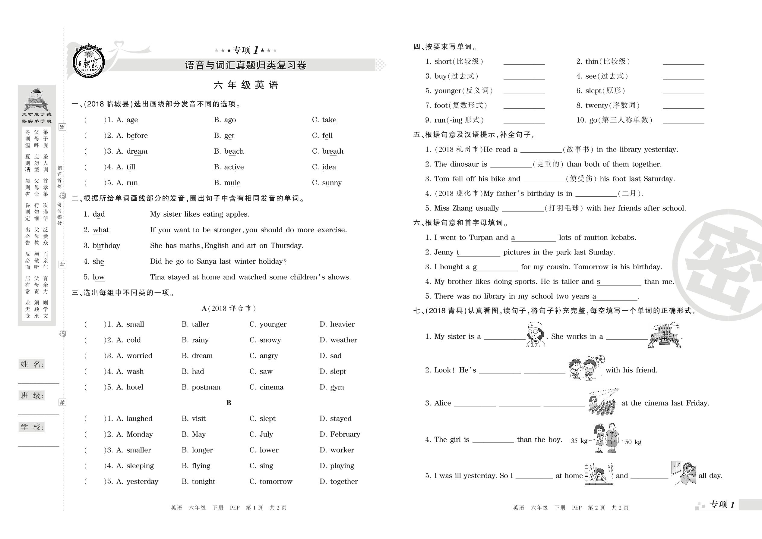 王朝霞期末专项卷——语音与词汇、句子(一)真题归类复习卷六年级下册英语(PEP版)_R210807163204【0】