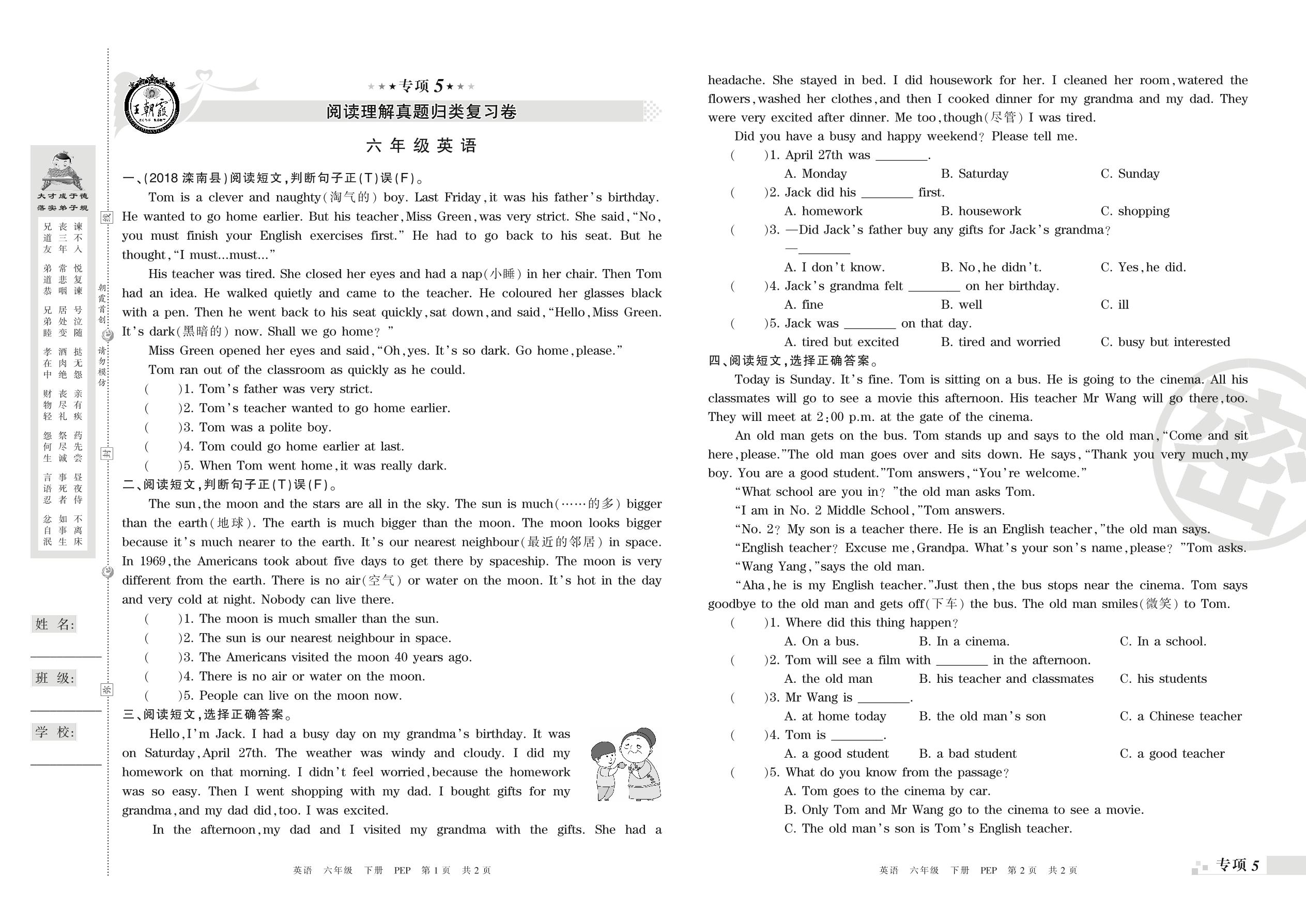 王朝霞期末专项卷——阅读理解、写作真题归类复习卷六年级下册英语(PEP版)_R210807163210【0】