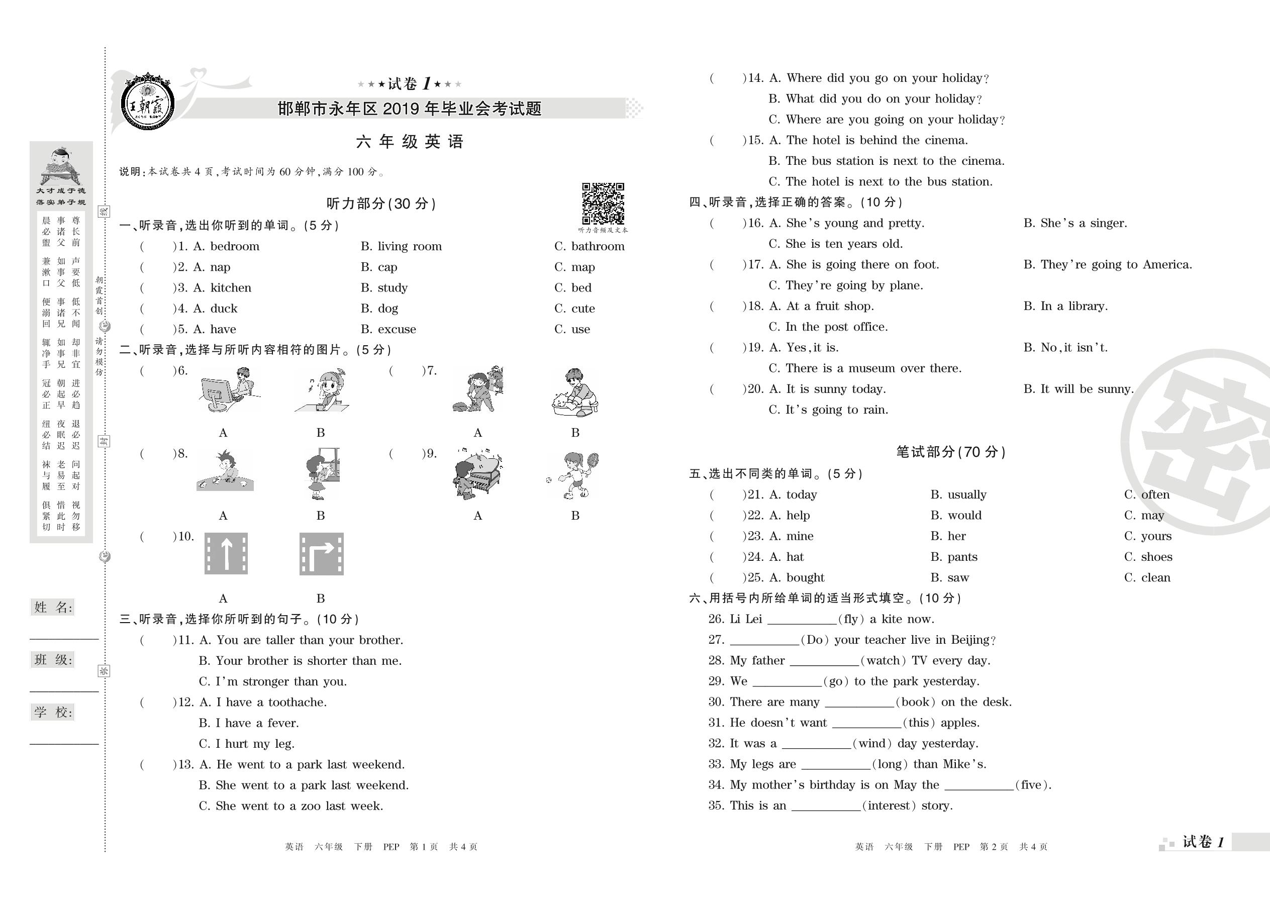 2018-2019学年第二学期邯郸市永年区六年级英语试卷(PEP版)【1】