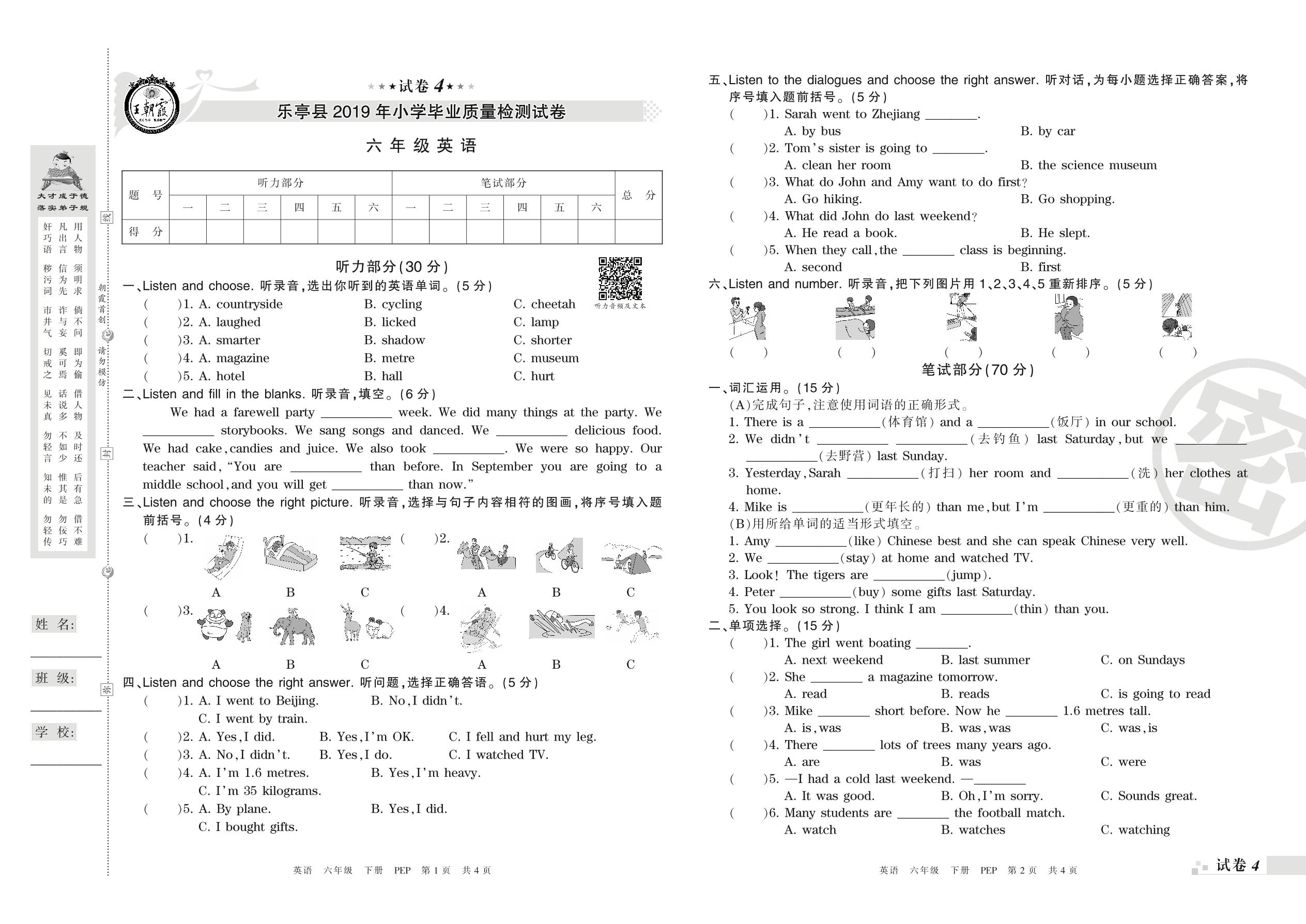 2018-2019学年第二学期唐山市乐亭县六年级英语试卷(PEP版)【4】