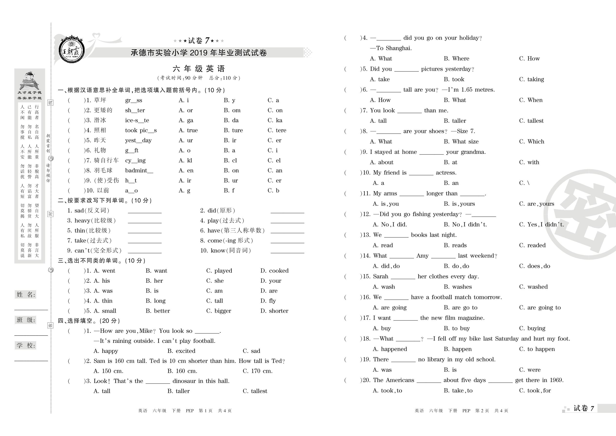 2018-2019学年第二学期承德市实验小学六年级英语试卷(PEP版)【7】