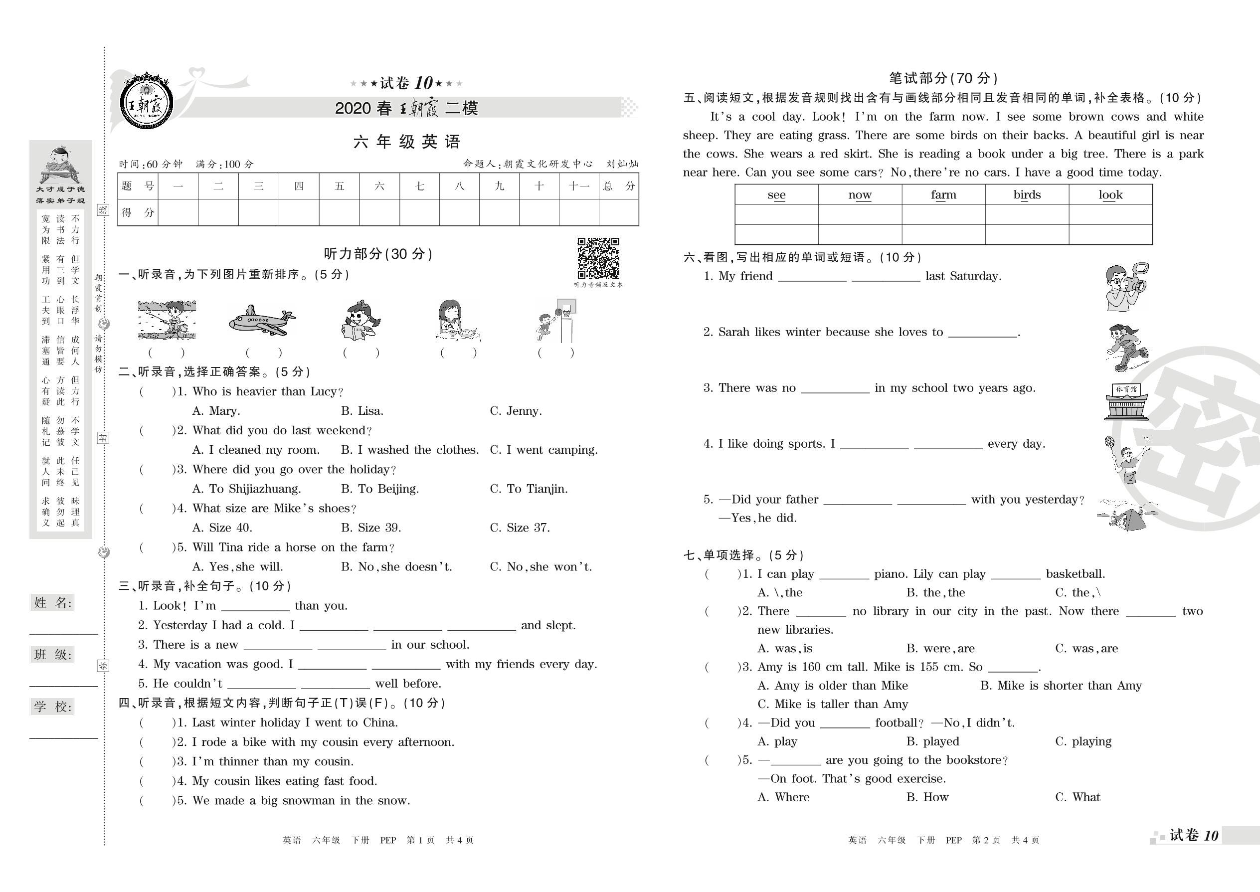 王朝霞期末模拟卷六年级下册英语(PEP版)_R210807163254【10】