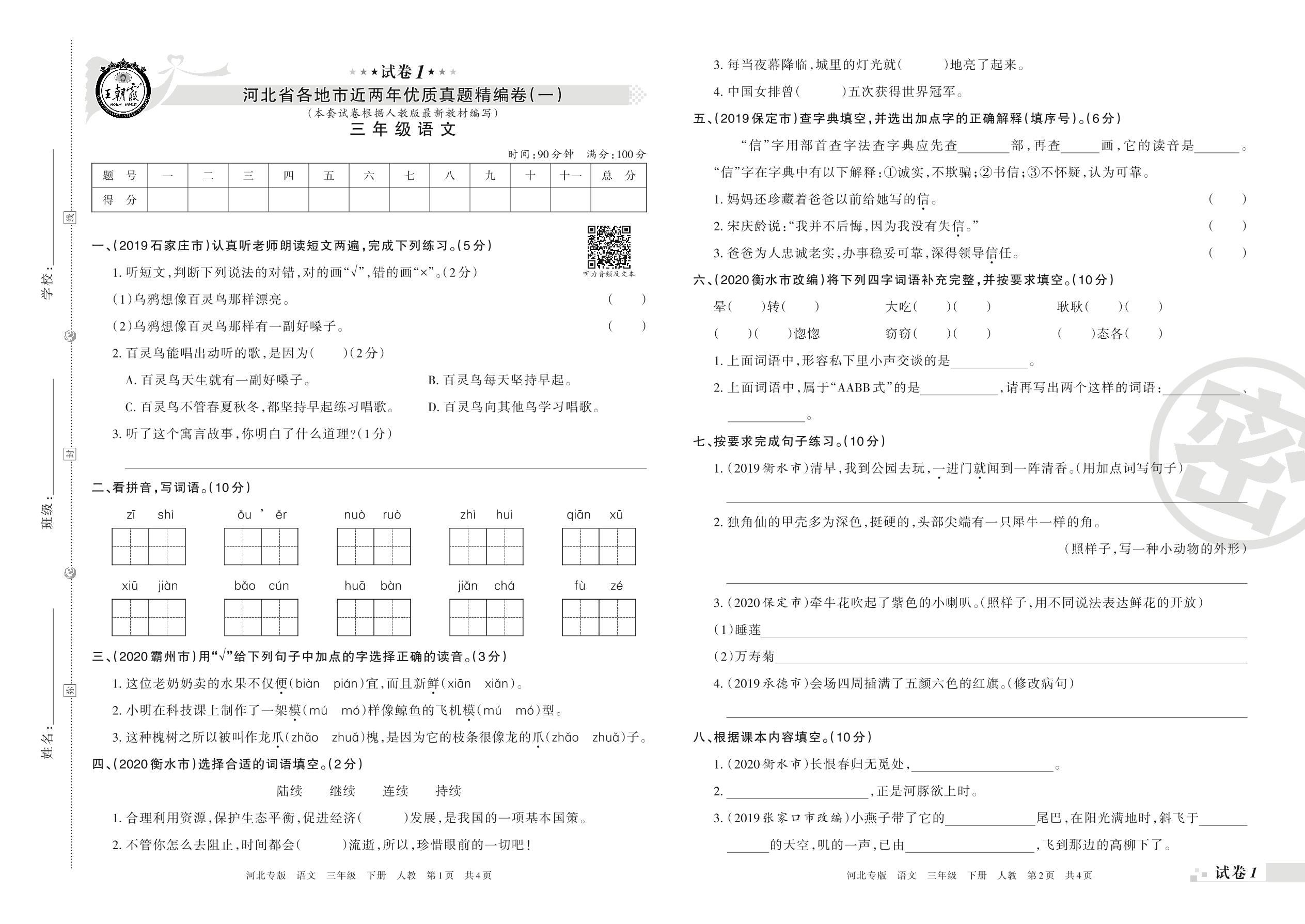 河北省各地市近两年优质真题精编卷(一)三年级下册语文(人教版)【1】