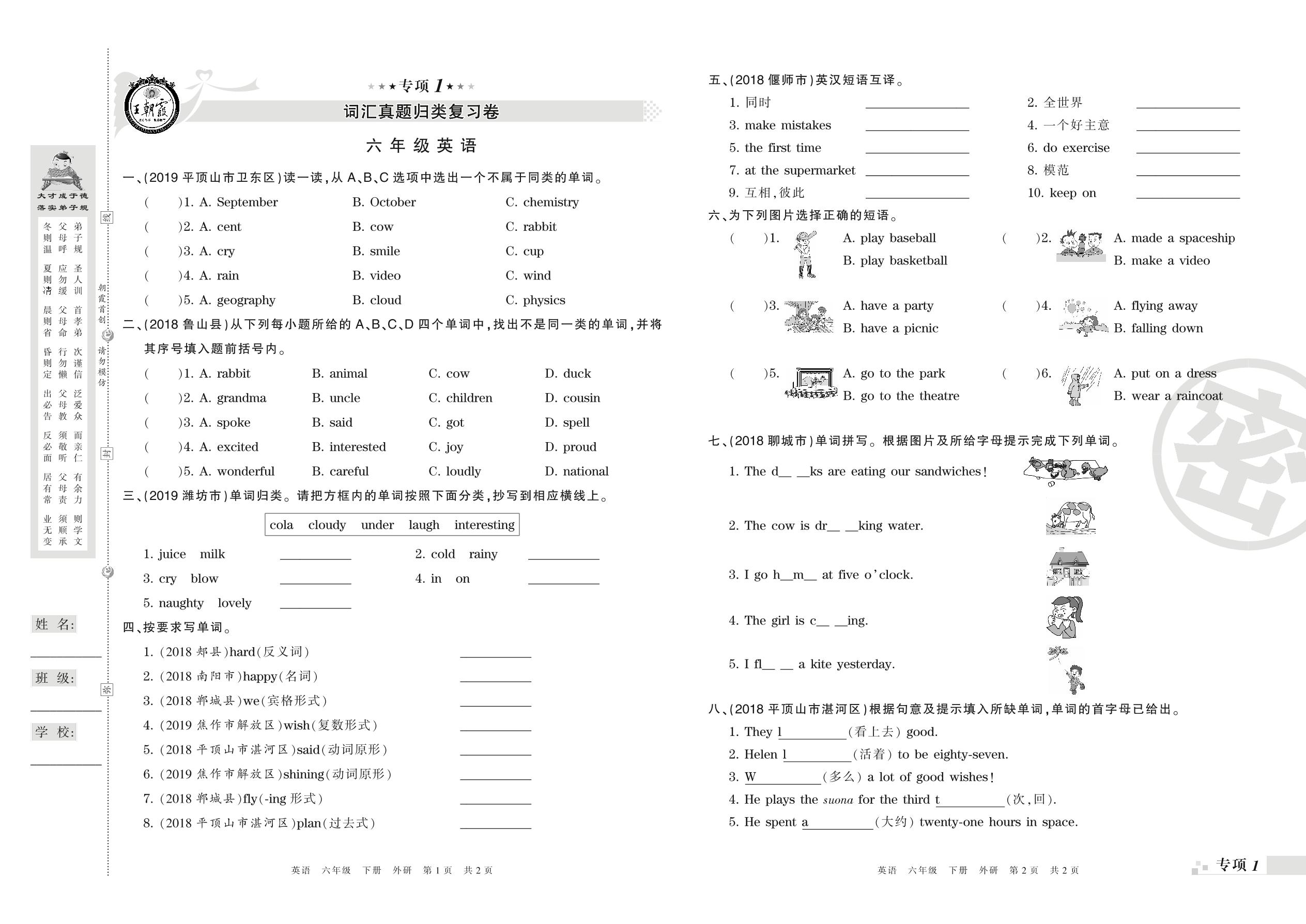 王朝霞期末专项卷——词汇、句子(一)真题归类复习卷六年级下册英语(外研版)_R210807163302【0】