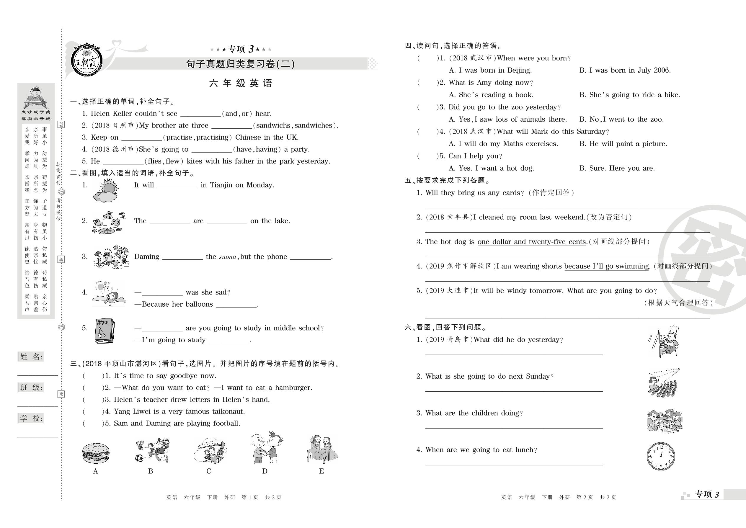 王朝霞期末专项卷——句子(二)、情景交际真题归类复习卷六年级下册英语(外研版)_R210807163308【0】