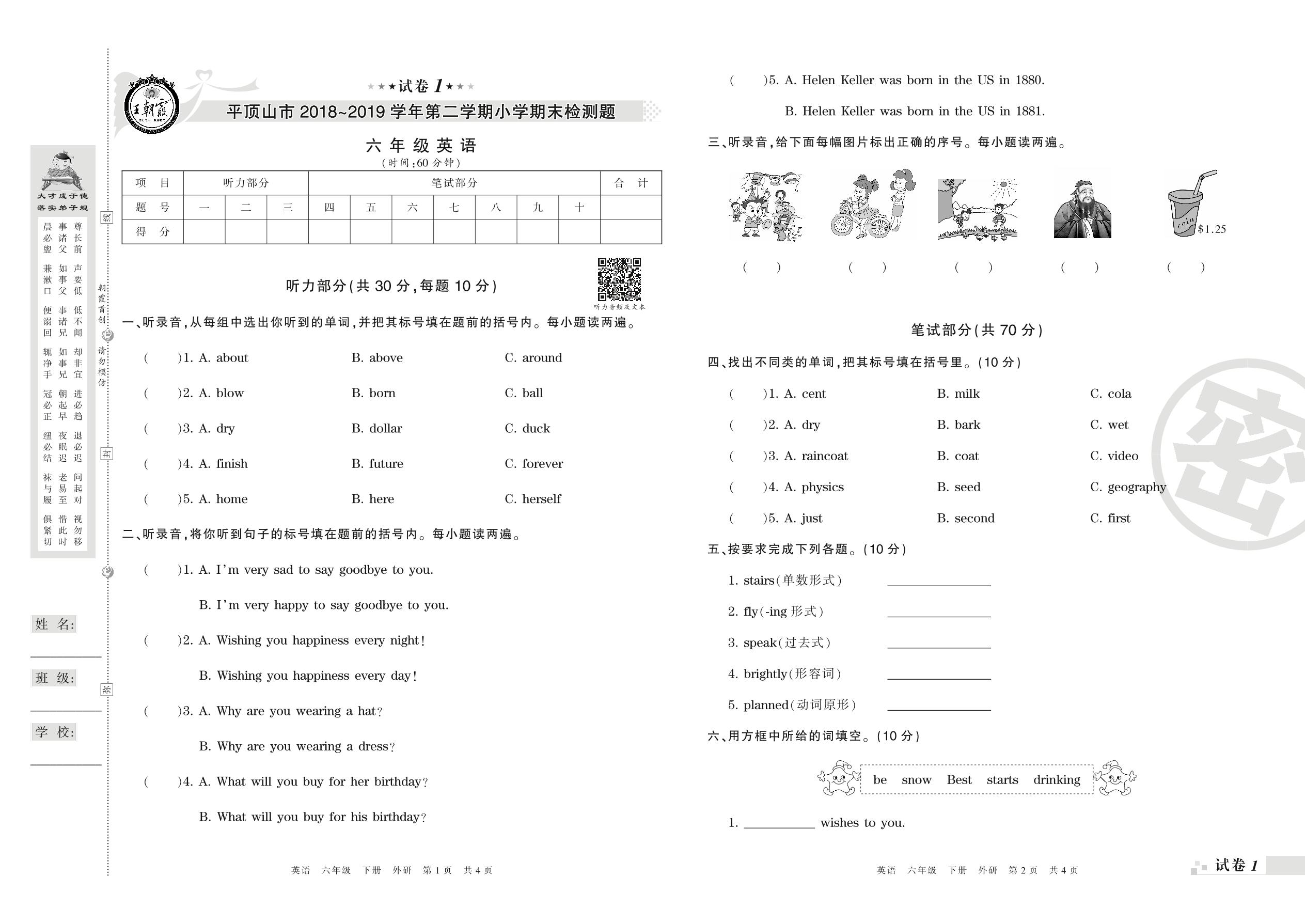 2018-2019学年第二学期平顶山市六年级英语试卷(外研版)【1】