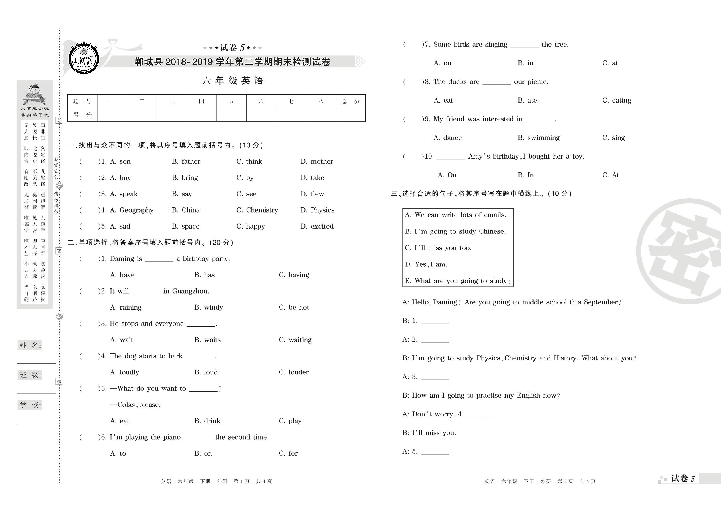 2018-2019学年第二学期周口市郸城县六年级英语试卷(外研版)【5】
