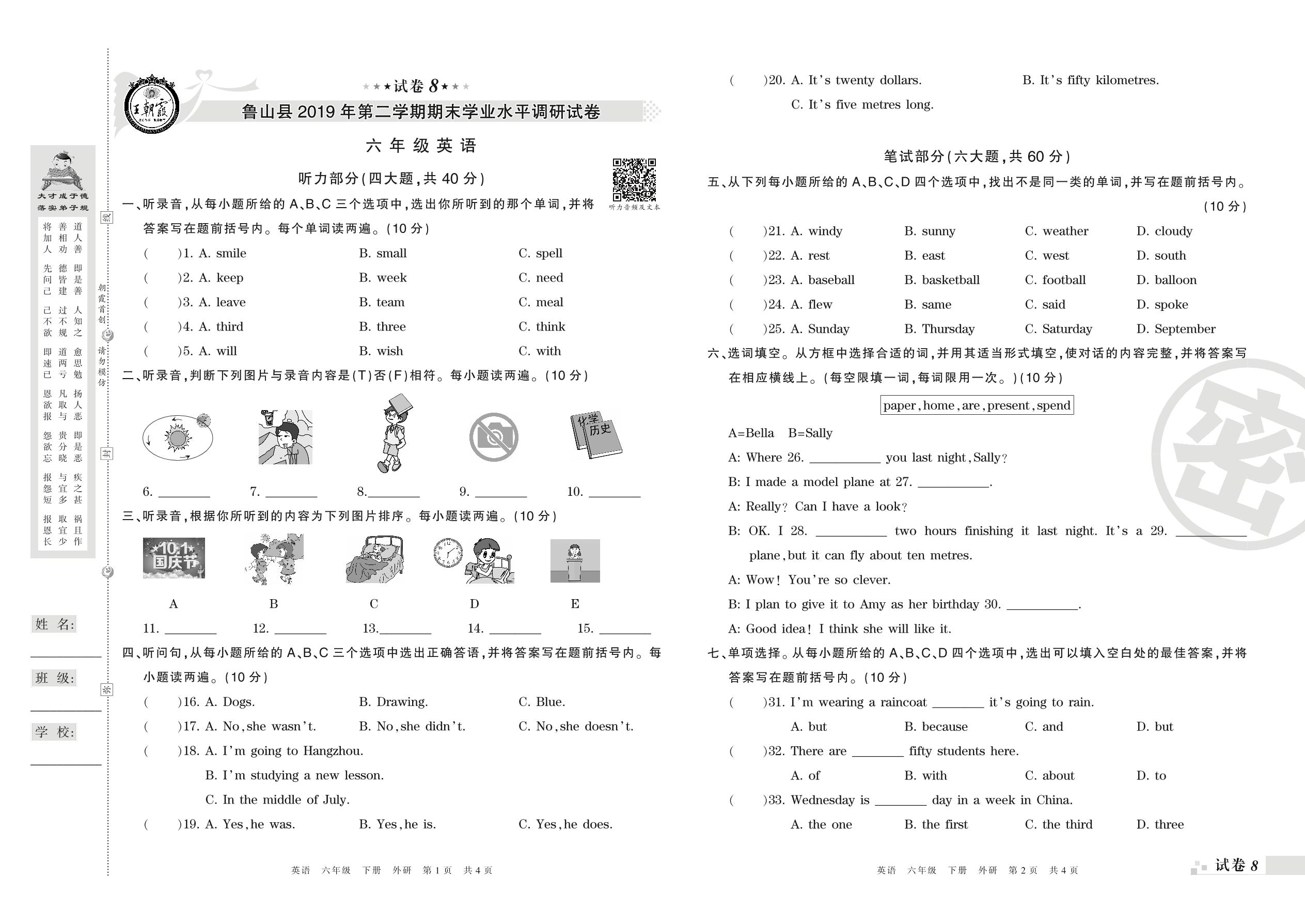 2018-2019学年第二学期平顶山市鲁山县六年级英语试卷(外研版)【8】