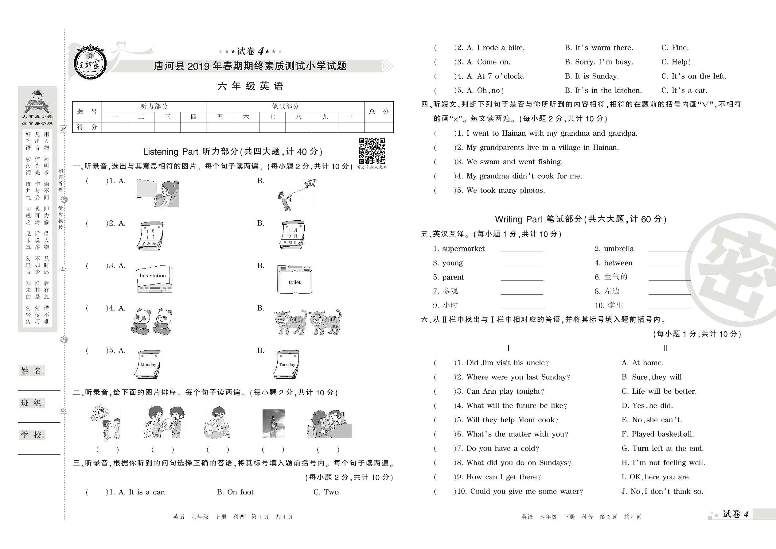 2018-2019学年第二学期南阳市唐河县六年级英语试卷(科普版)【4】