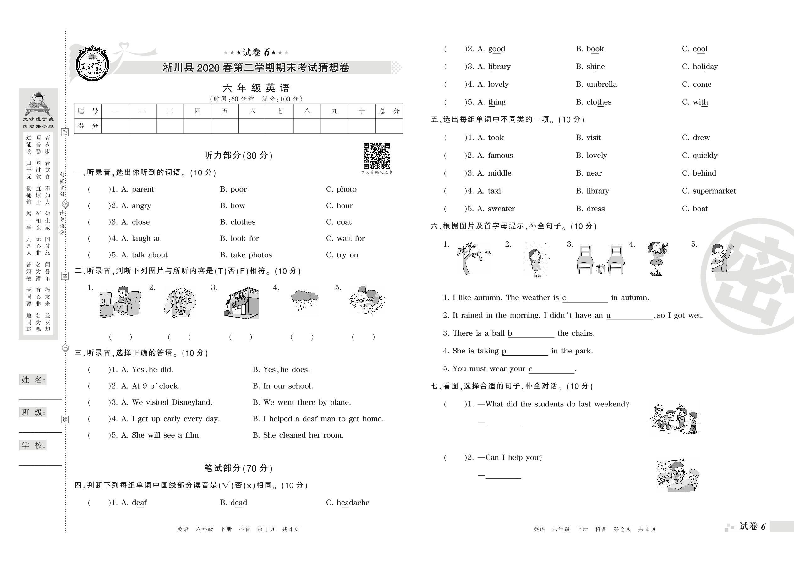 2018-2019学年第二学期南阳市淅川县六年级英语试卷(科普版)【6】