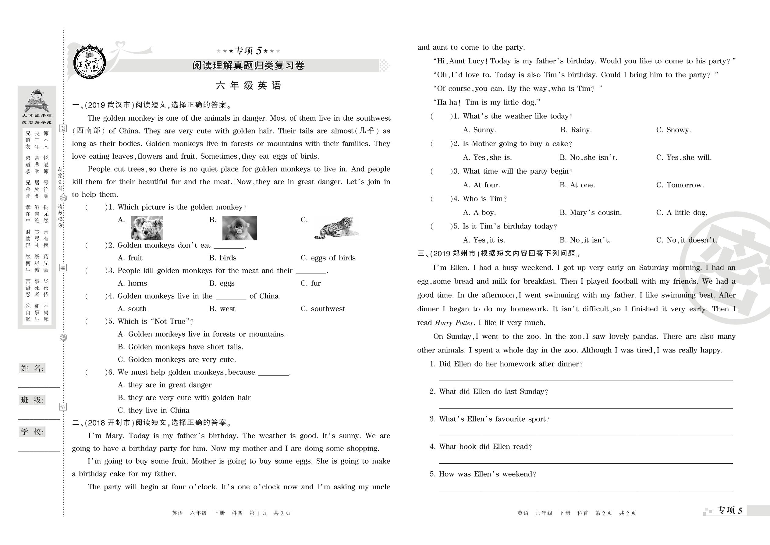 王朝霞期末专项卷——阅读理解、书面表达真题归类复习卷六年级下册英语(科普版)_R210807163524【0】