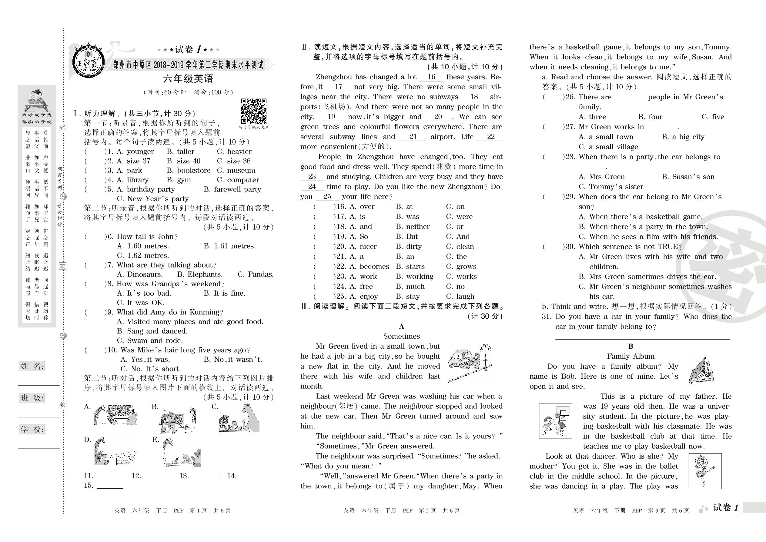 2018-2019学年第二学期郑州市中原区六年级英语试卷(PEP版)_R210807163609【1】
