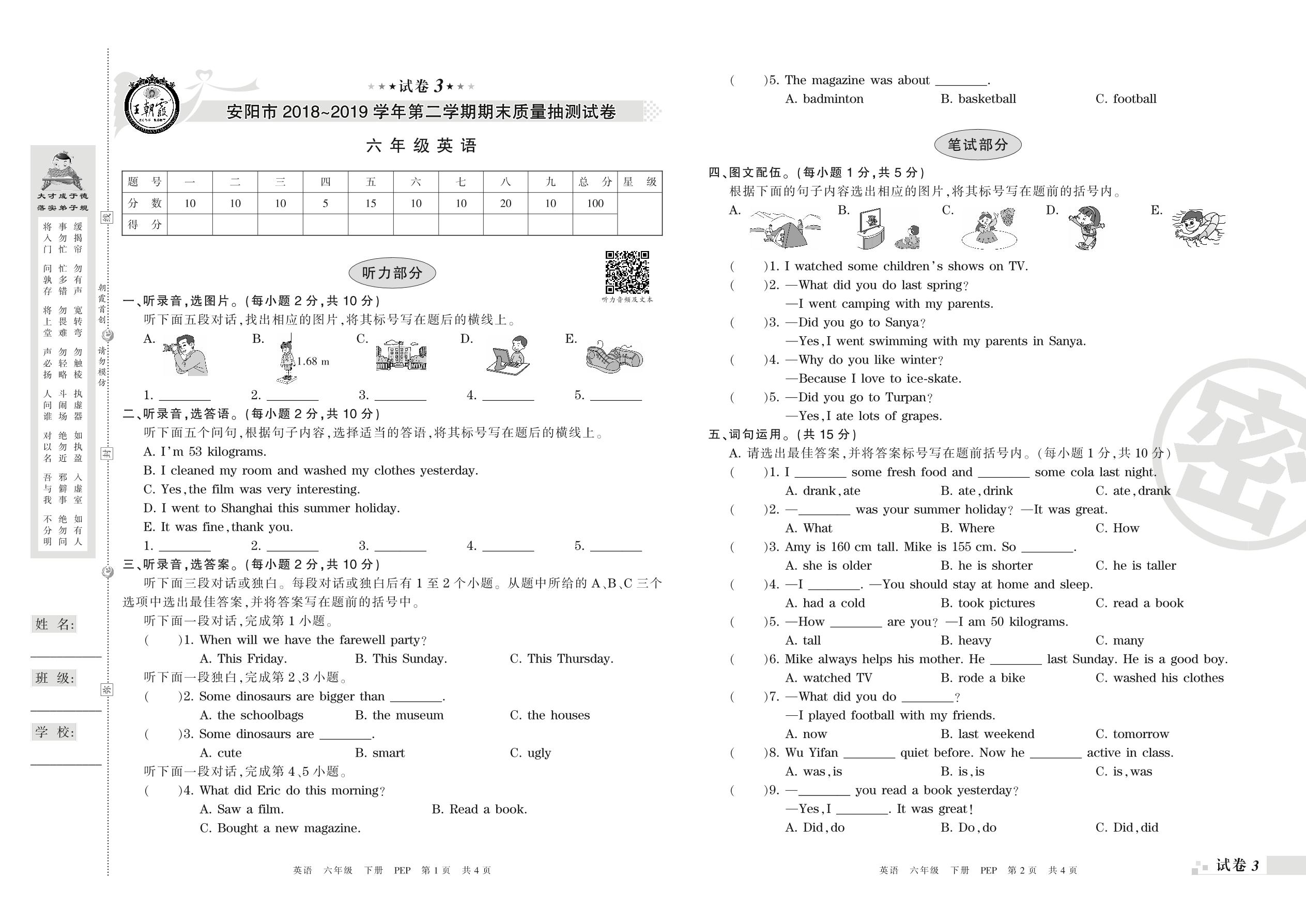 2018-2019学年第二学期安阳市六年级英语试卷(PEP版)【3】