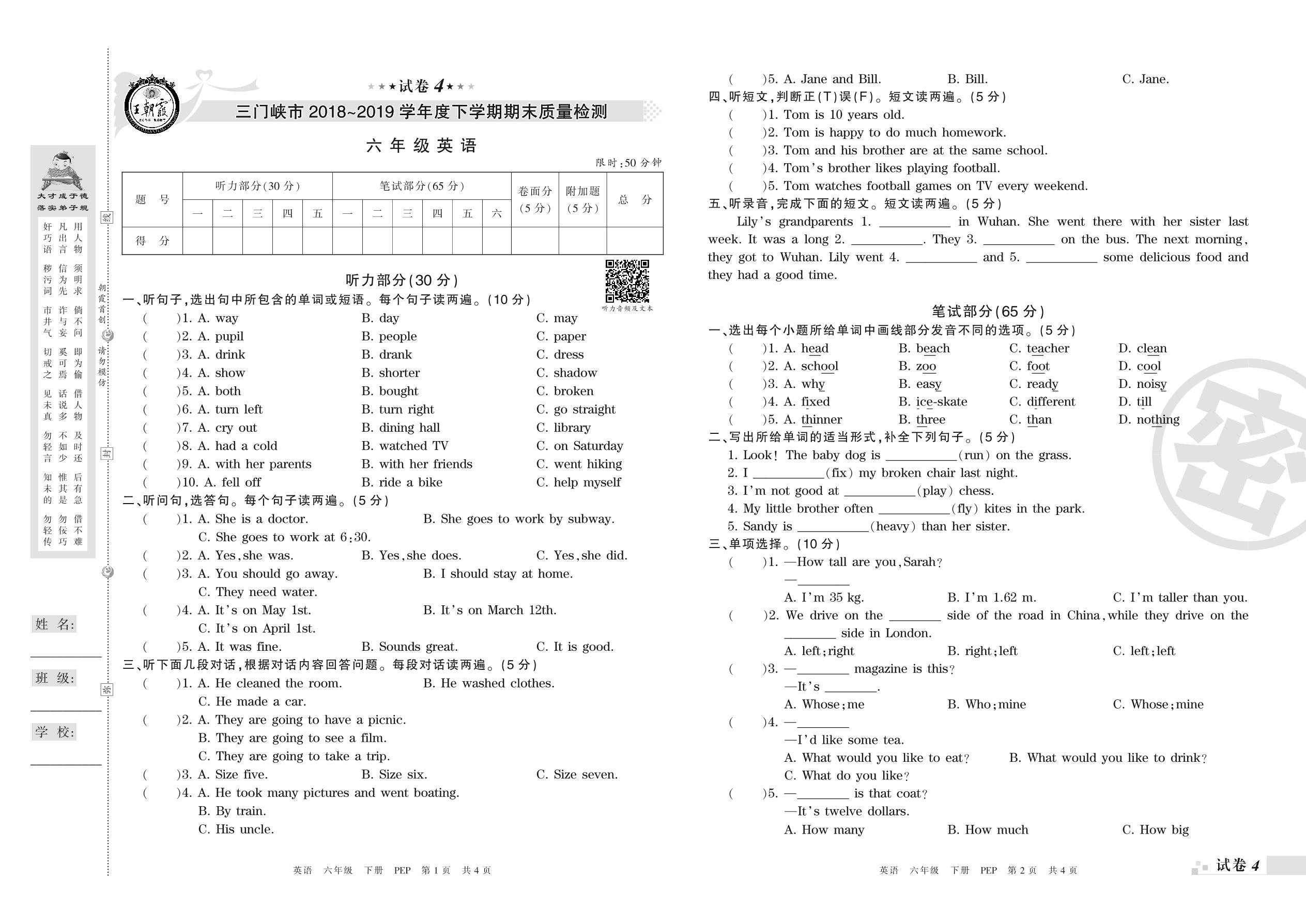 2018-2019学年第二学期三门峡市六年级英语试卷(PEP版)【4】