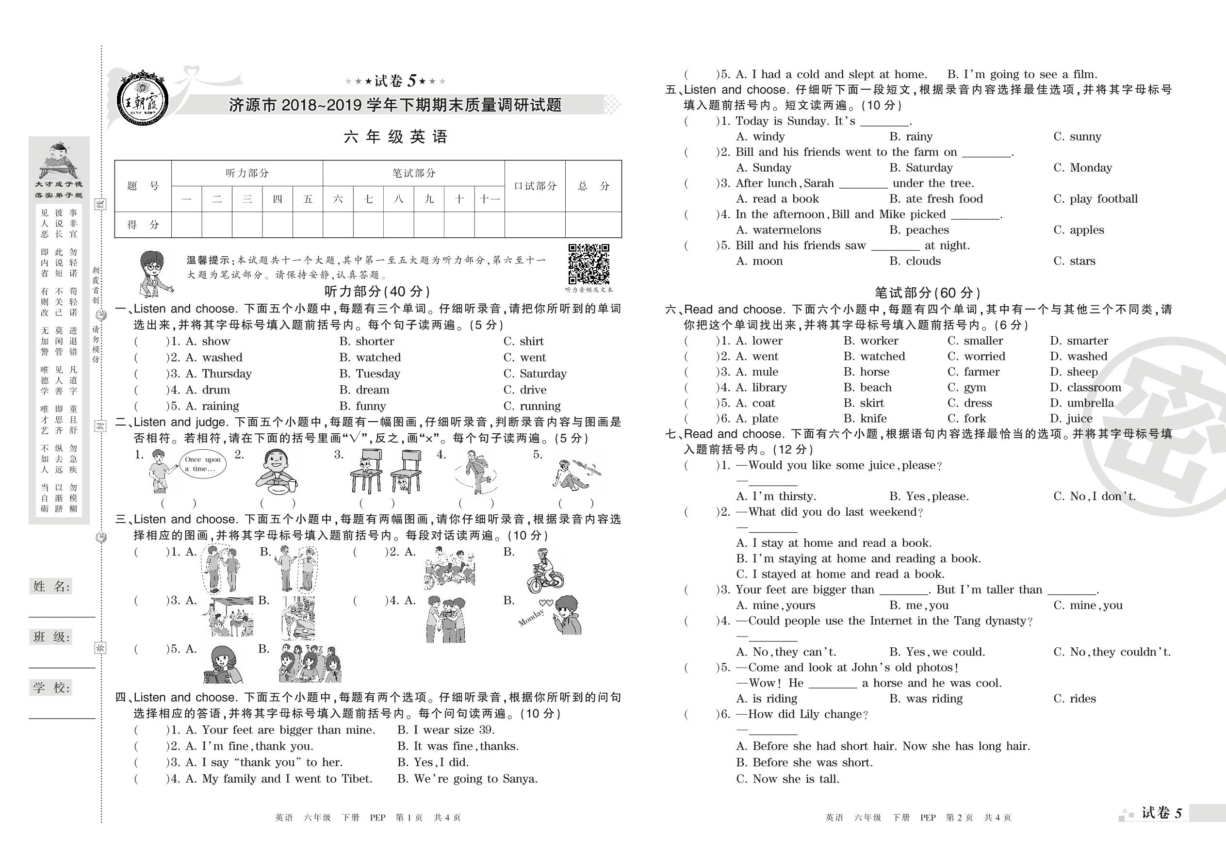 2018-2019学年第二学期济源市六年级英语试卷(PEP版)【5】