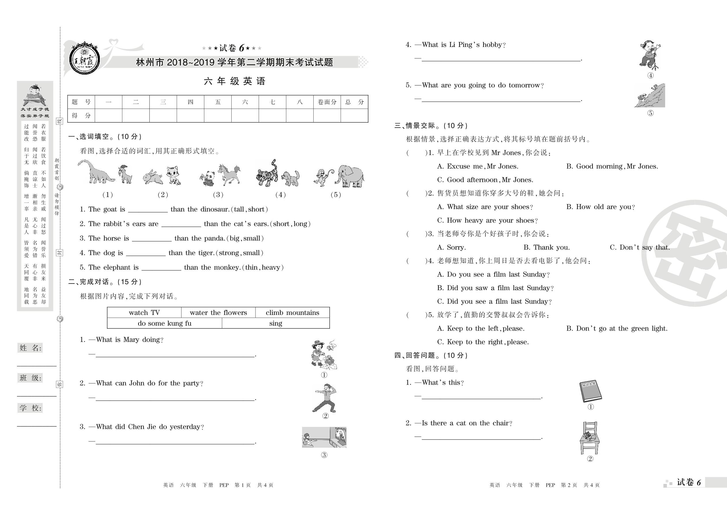 六年级英语人教PEP版(三起始)下册期末卷
