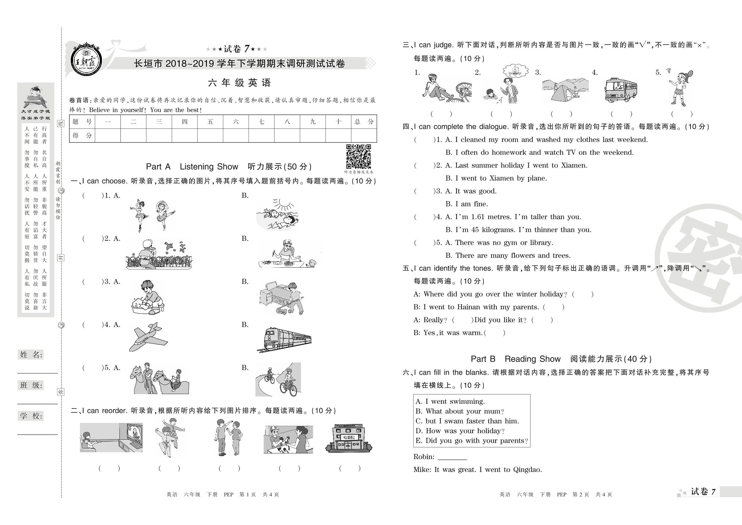 2018-2019学年第二学期长垣市六年级英语试卷(PEP版)【7】