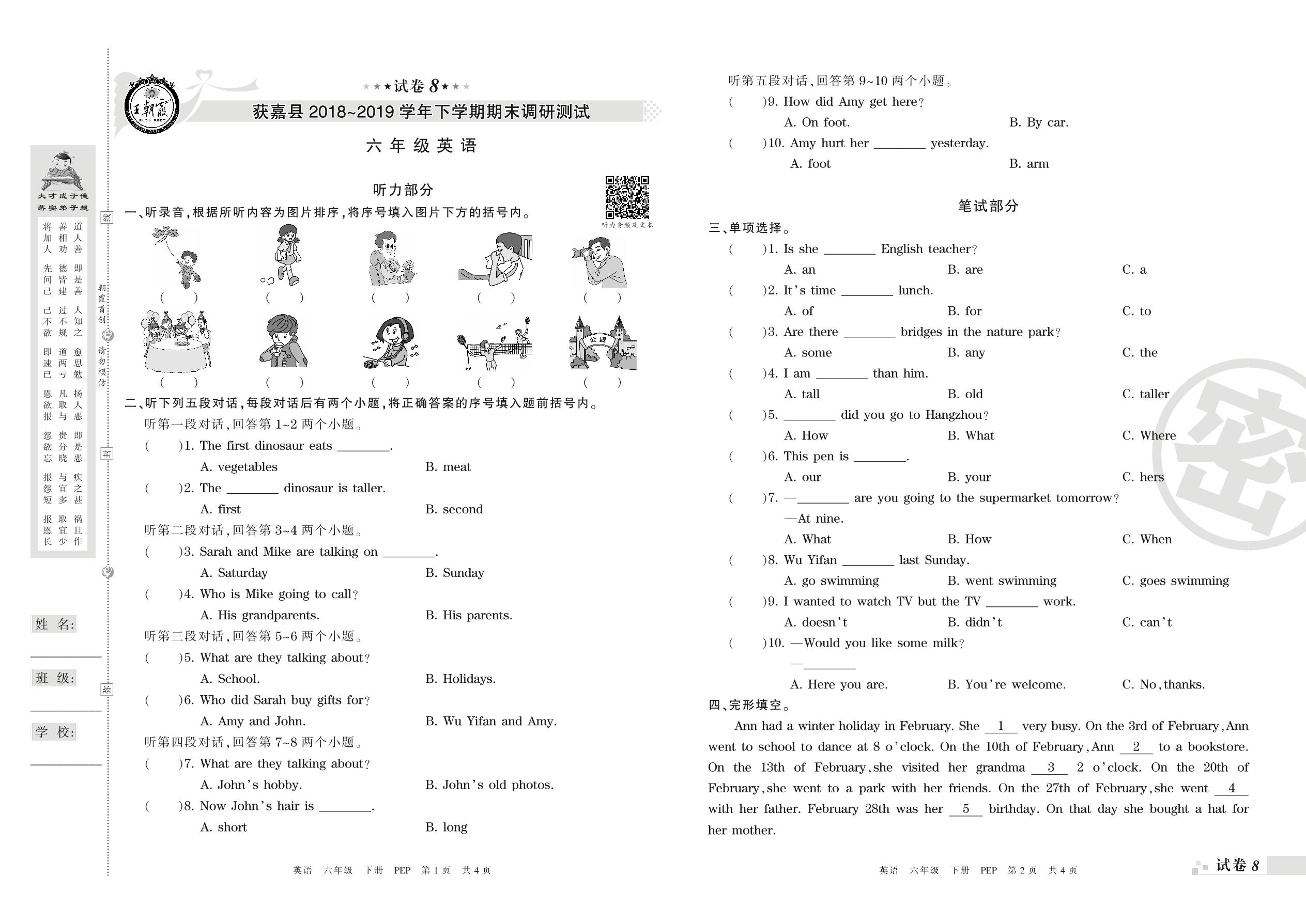 2018-2019学年第二学期新乡市获嘉县六年级英语试卷(PEP版)【8】