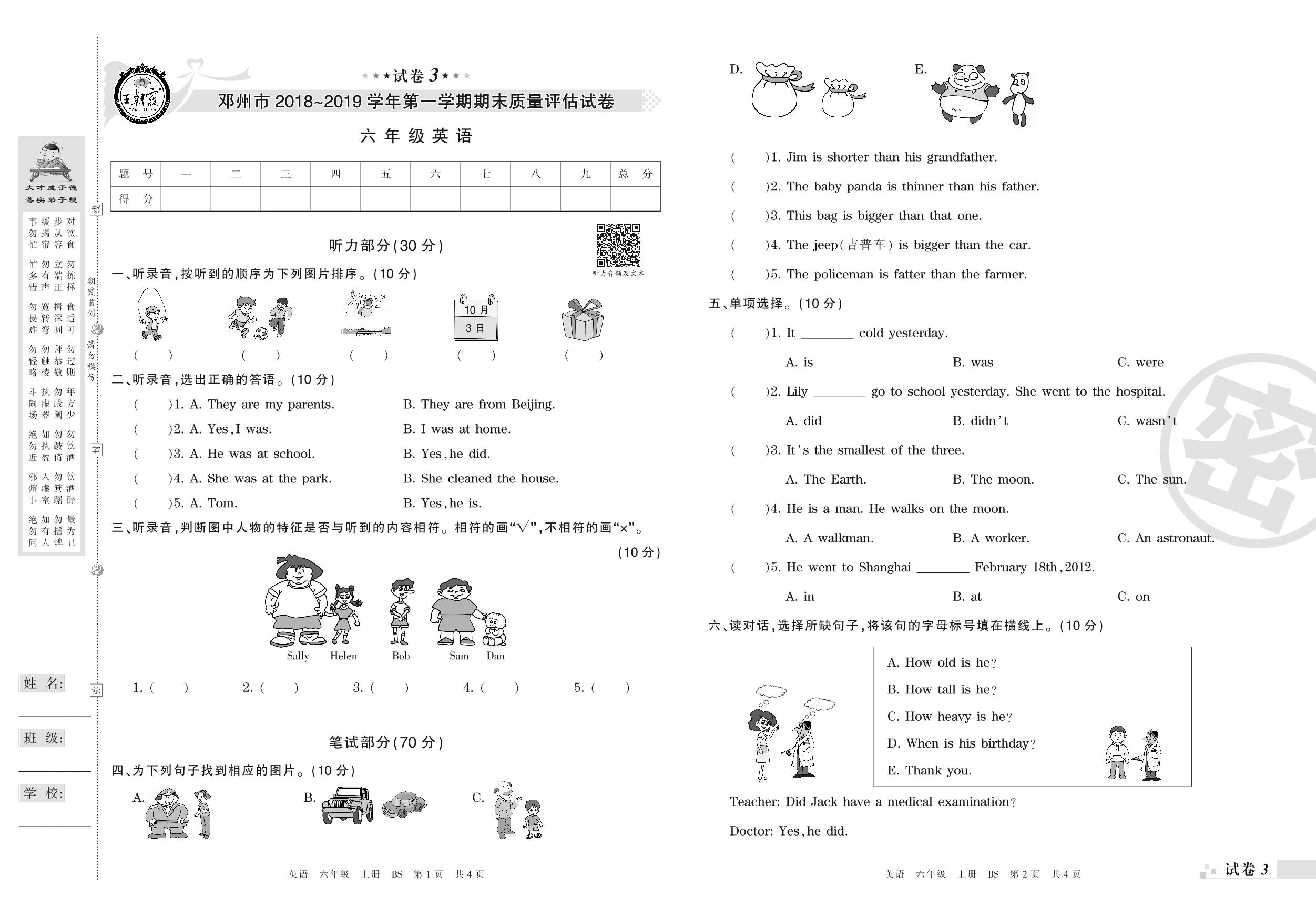 2018-2019学年第一学期邓州市六年级英语试卷(北师版)【3】