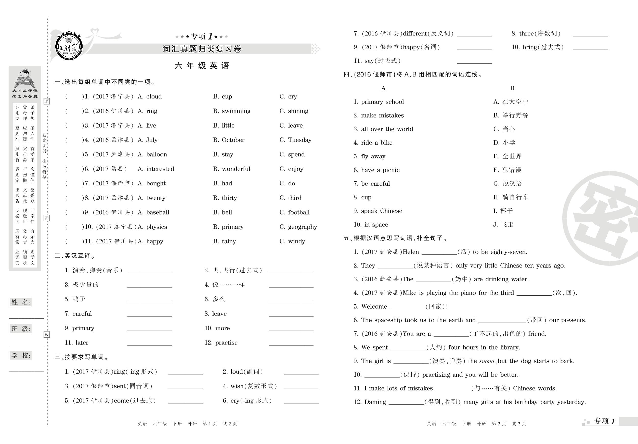 王朝霞期末专项卷——词汇、句子真题归类复习卷六年级下册英语(外研版)_R210807163837【0】