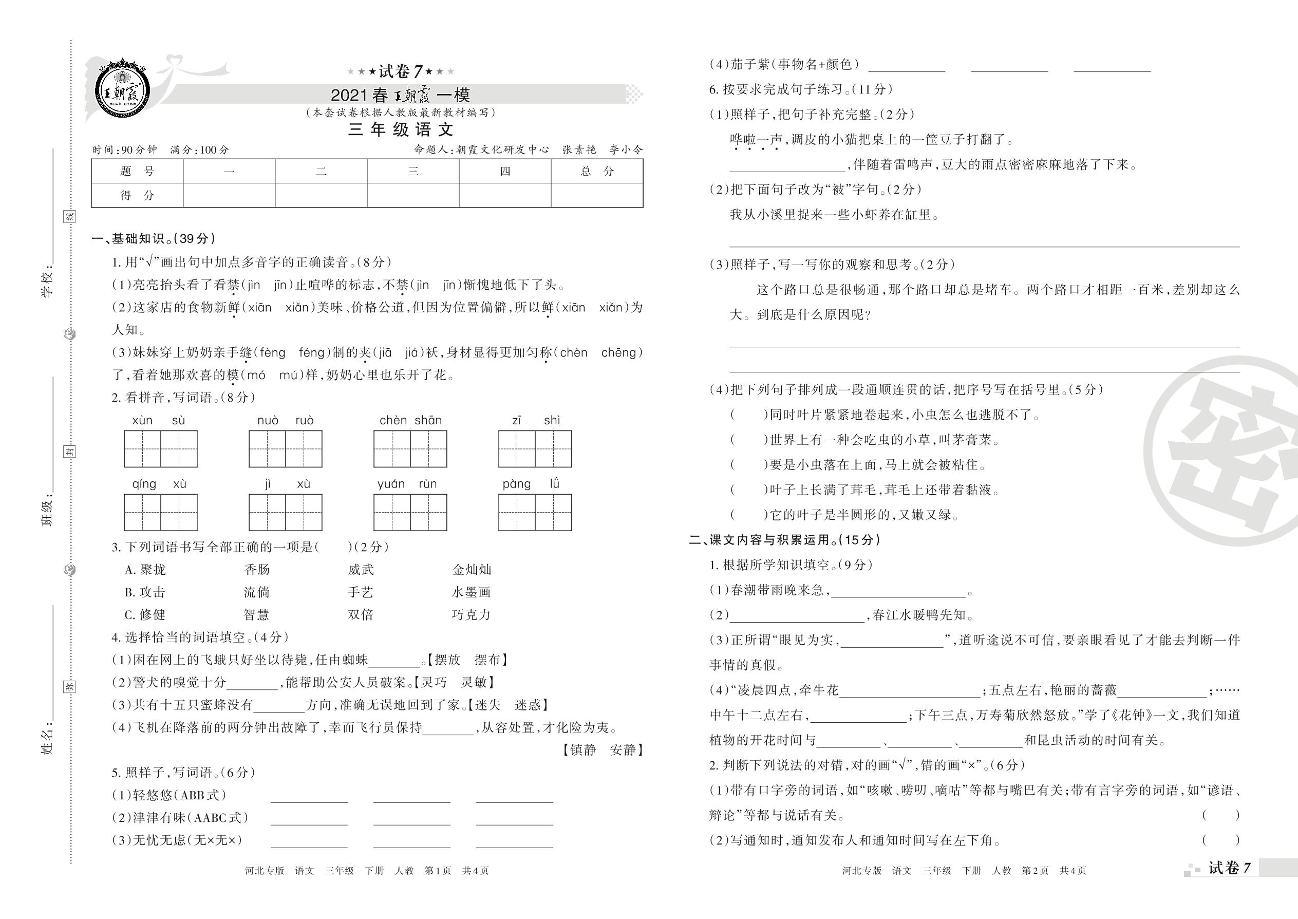 王朝霞期末模拟卷三年级下册语文(人教版)_R21080184045【7】