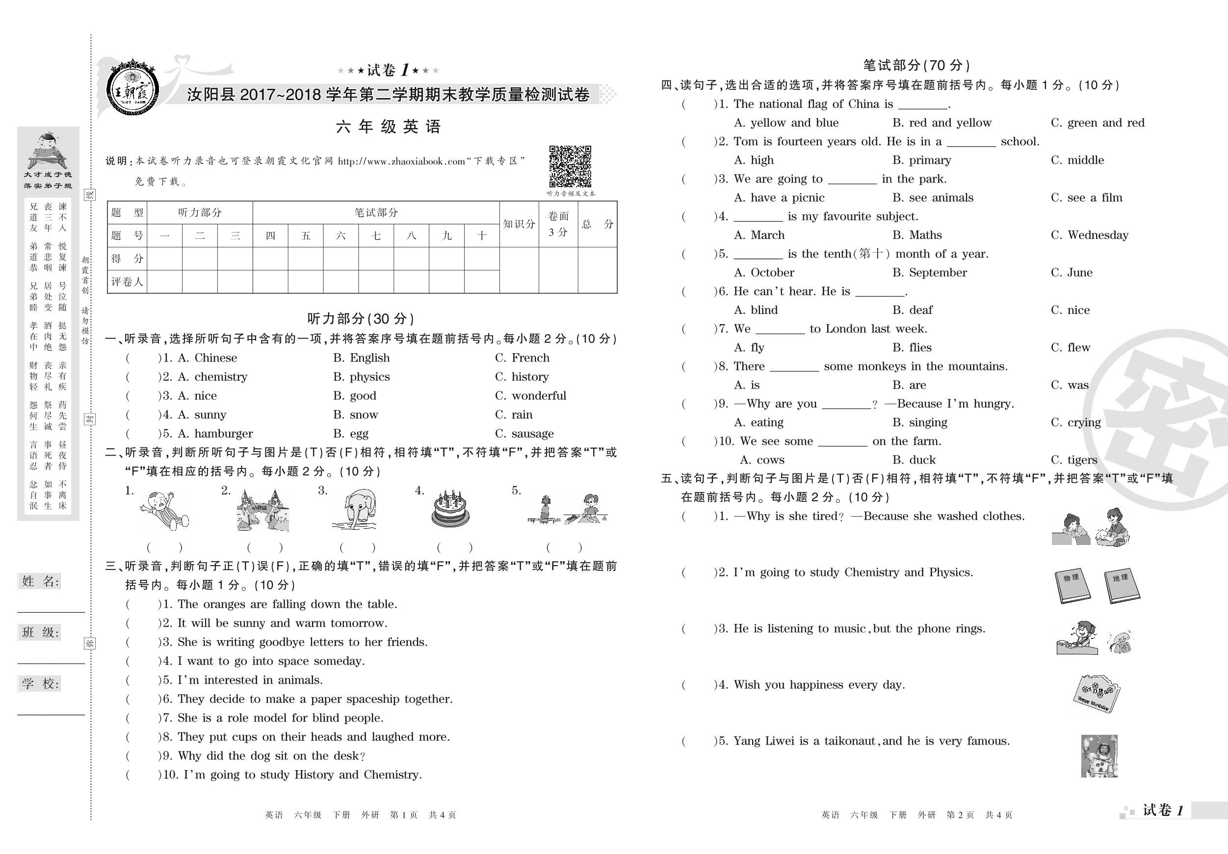 2017-2018学年第二学期洛阳市汝阳县六年级英语试卷(外研版)【1】