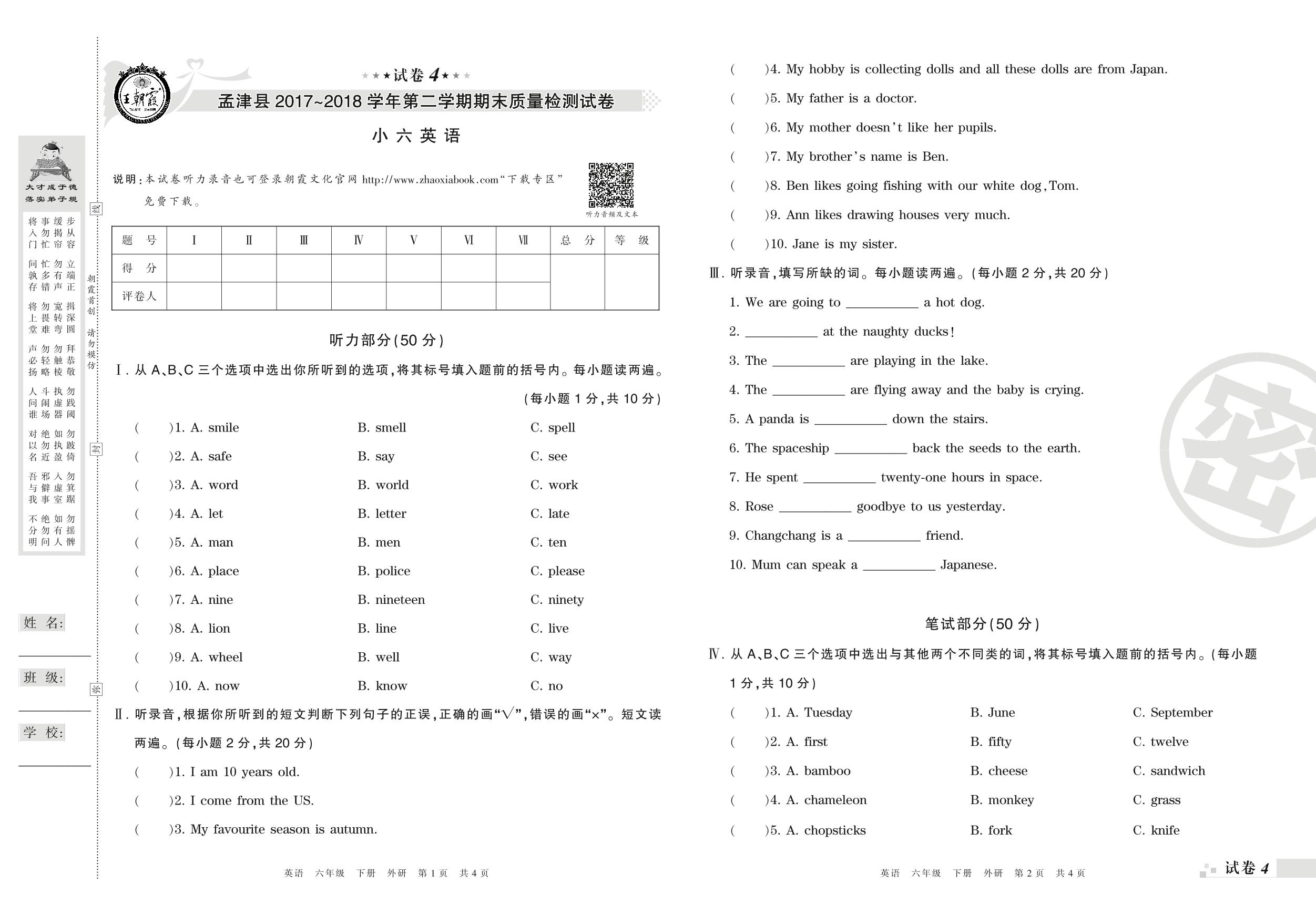2017-2018学年第二学期洛阳市孟津县六年级英语试卷(外研版)【4】
