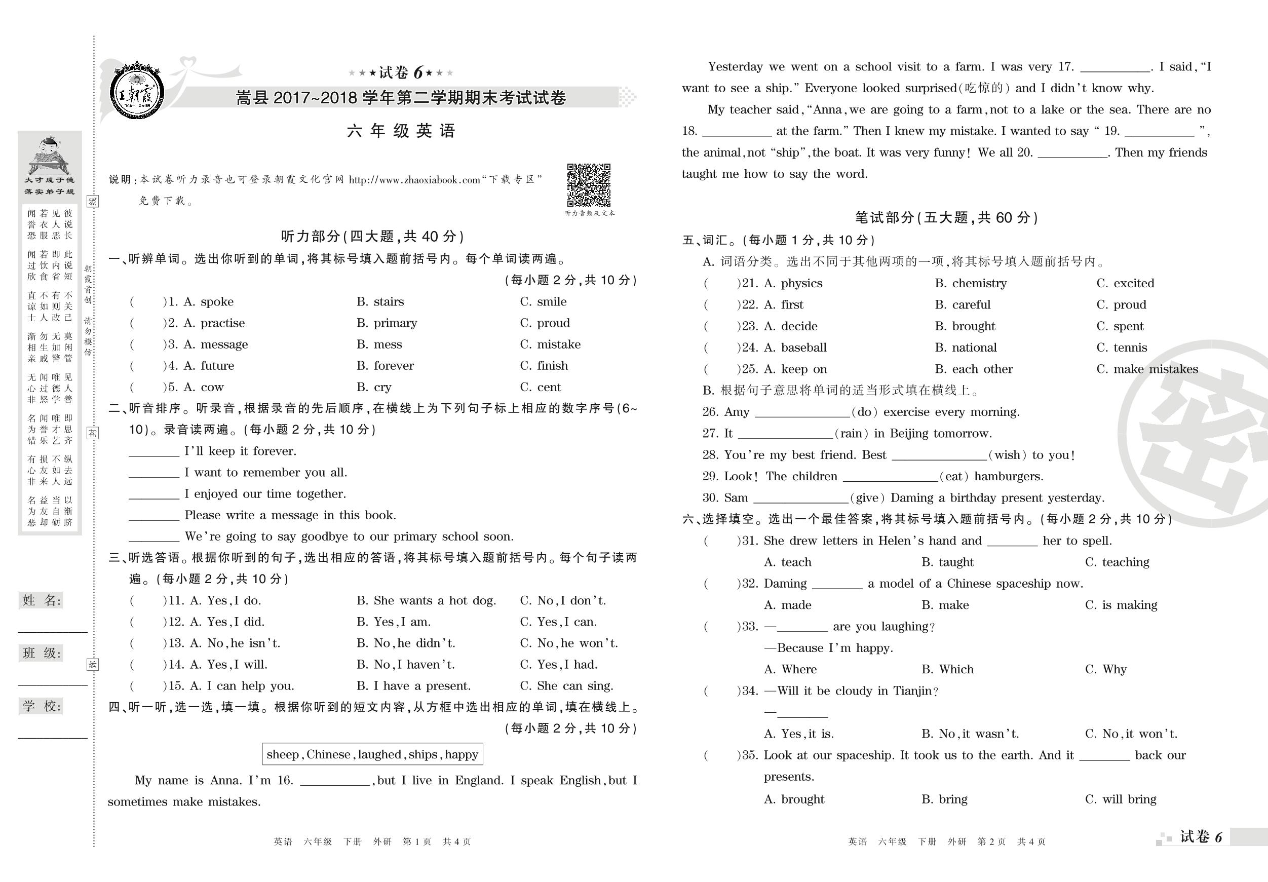 2017-2018学年第二学期洛阳市嵩县六年级英语试卷(外研版)【6】