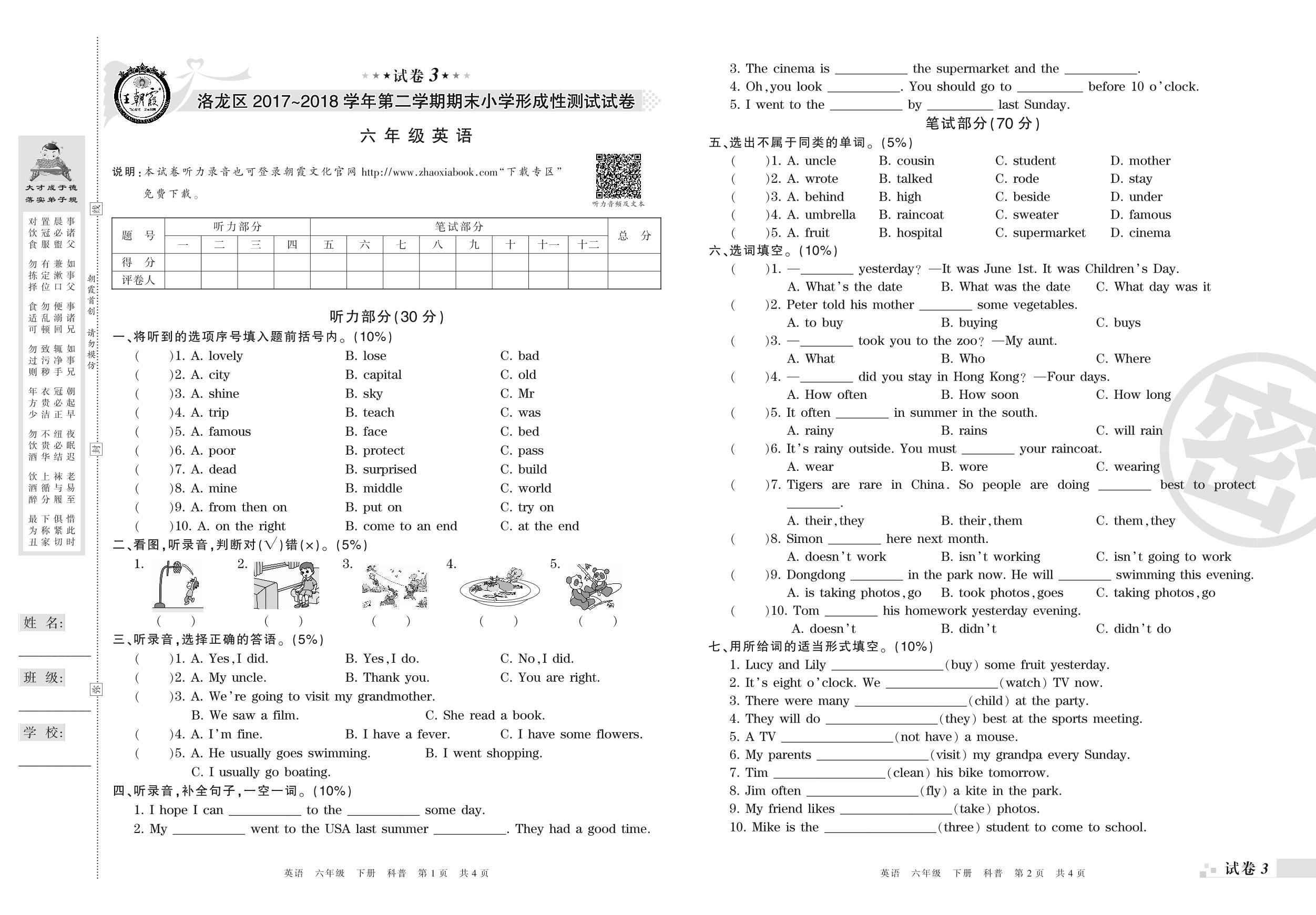 2017-2018学年第二学期洛阳市洛龙区六年级英语试卷(科普版)【3】