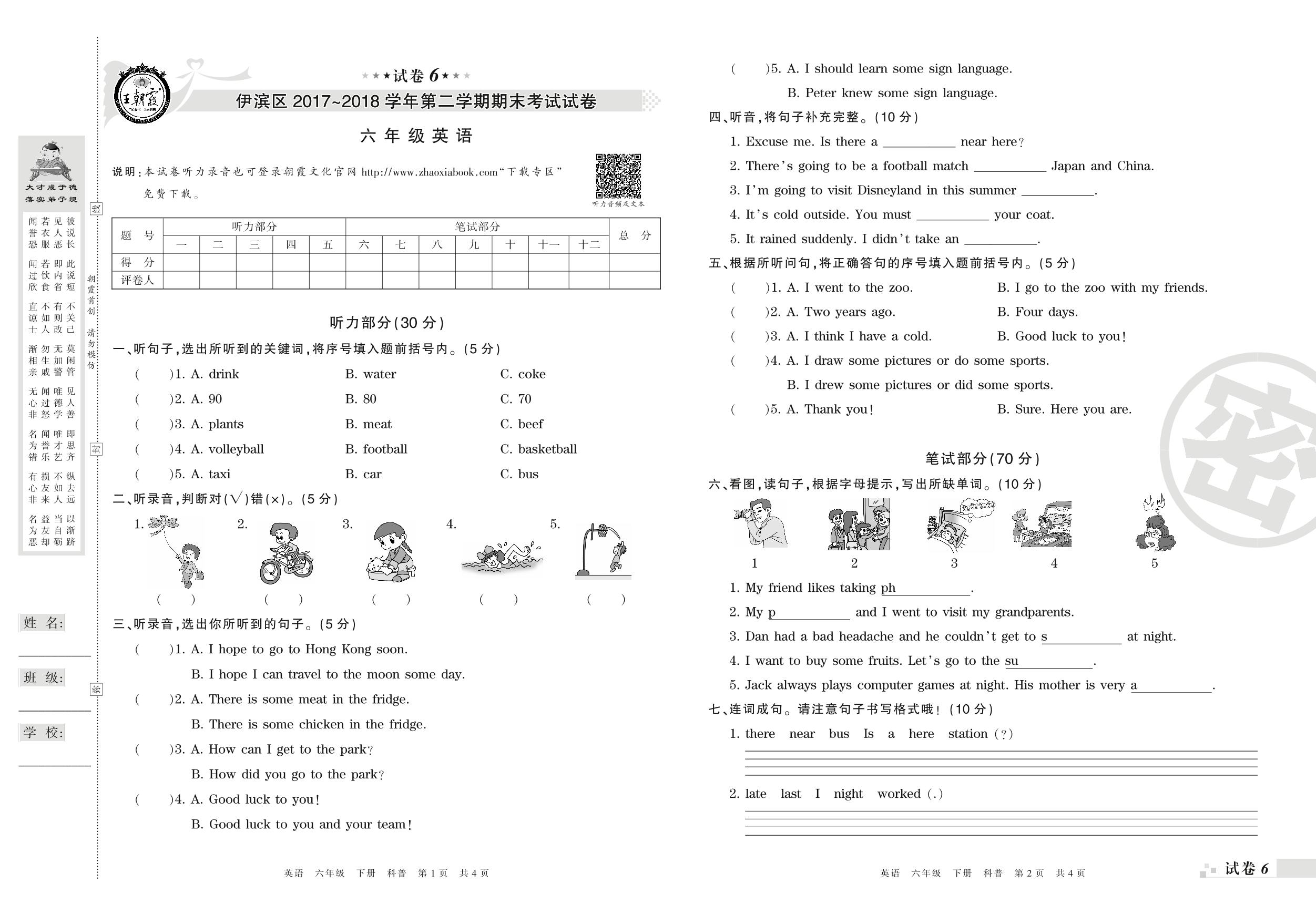 2017-2018学年第二学期洛阳市伊滨区六年级英语试卷(科普版)【6】