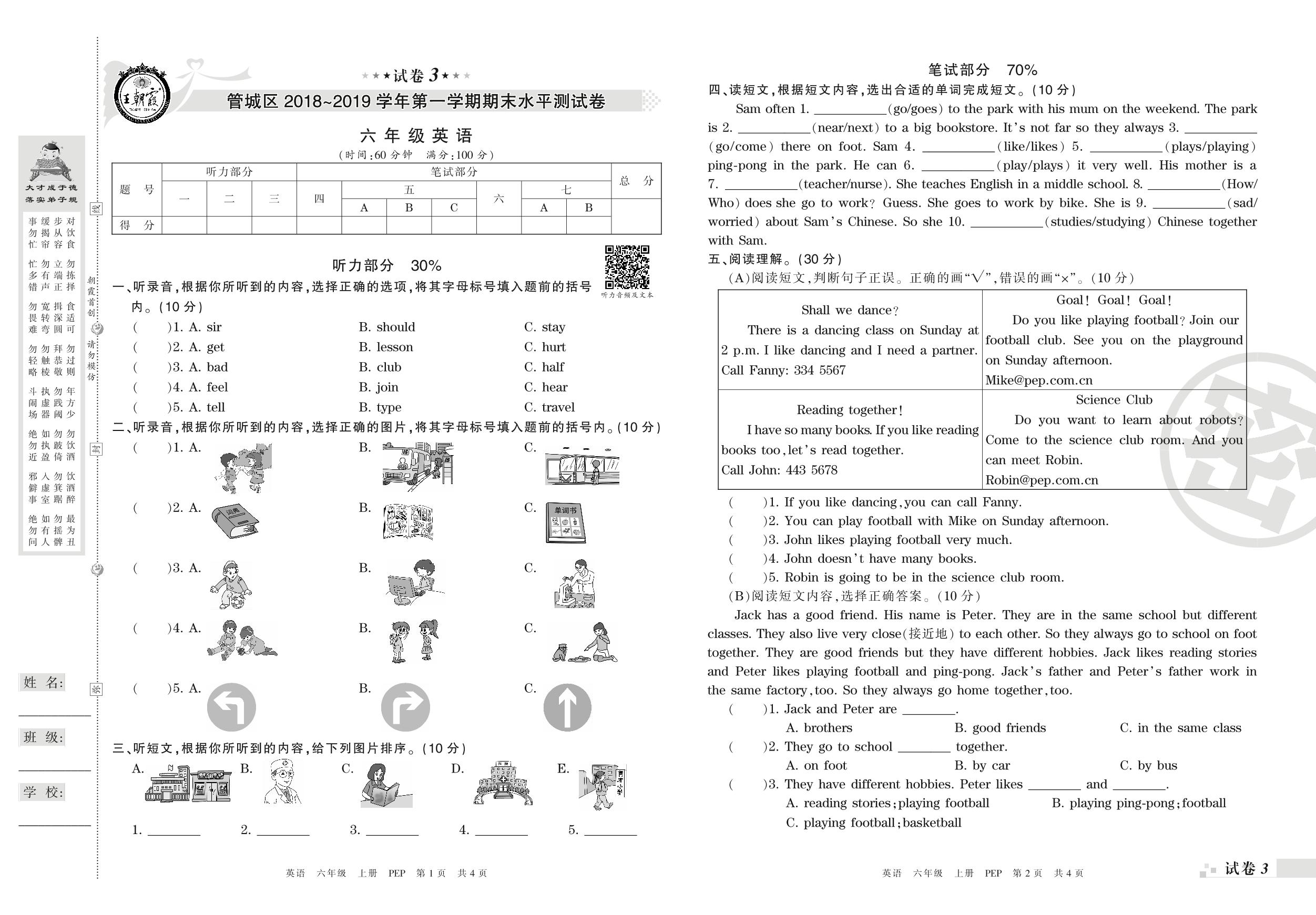 2018-2019学年第一学期郑州市管城区六年级英语试卷(PEP版)【3】