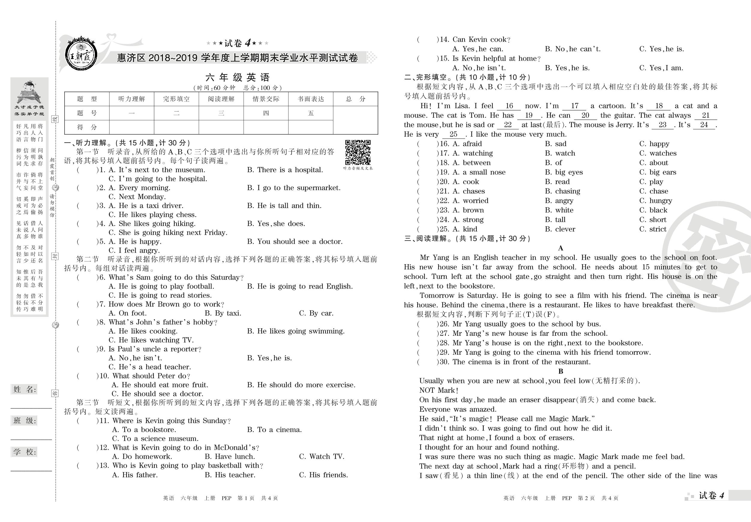 2018-2019学年第一学期郑州市惠济区六年级英语试卷(PEP版)【4】