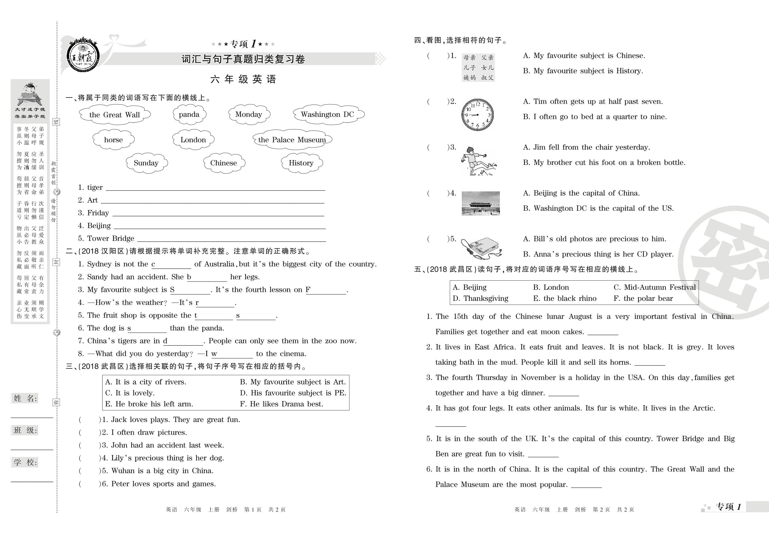 六年级英语剑桥版上册专项卷
