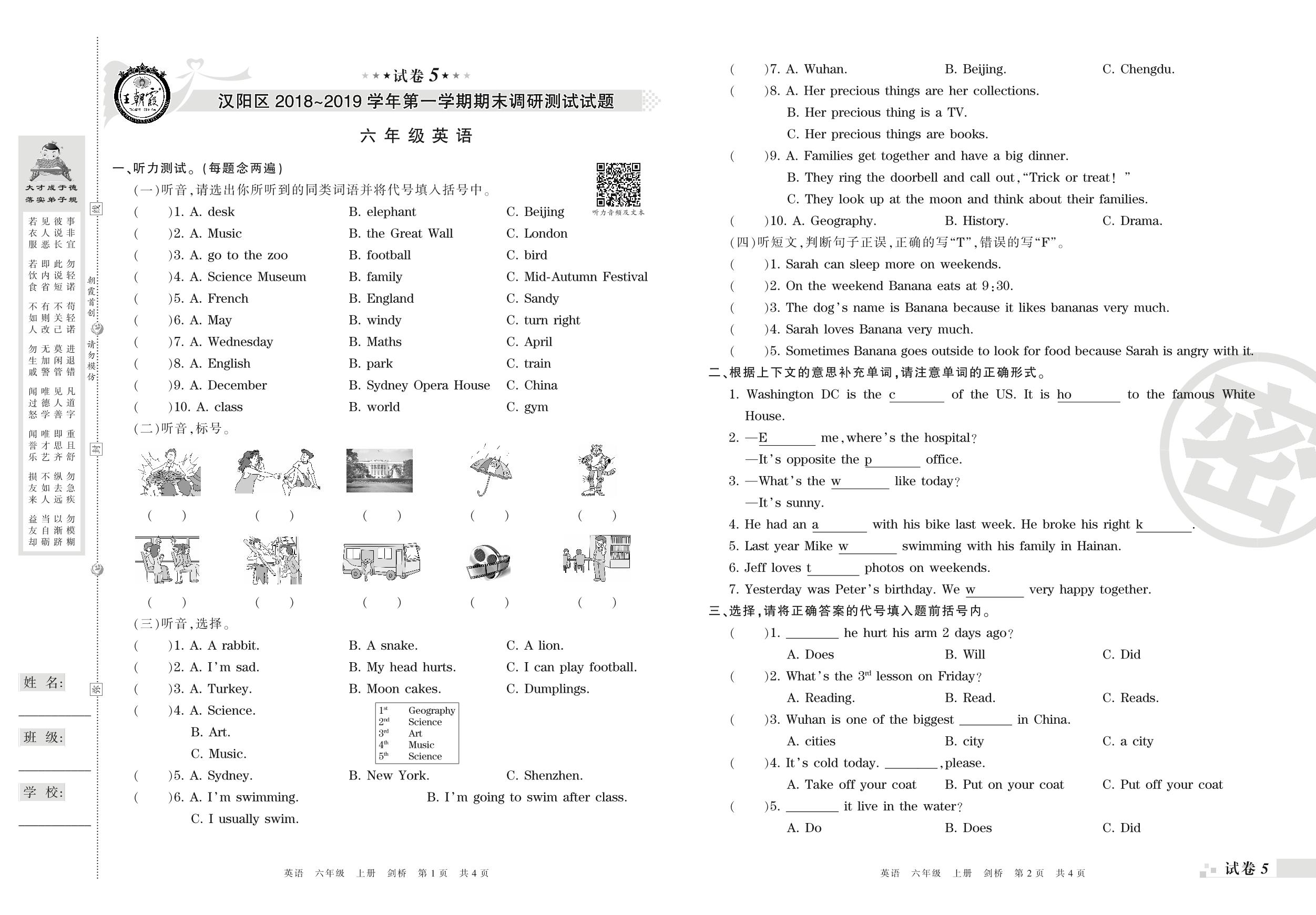 2018-2019学年第一学期武汉市汉阳区六年级英语试卷(剑桥版)【5】