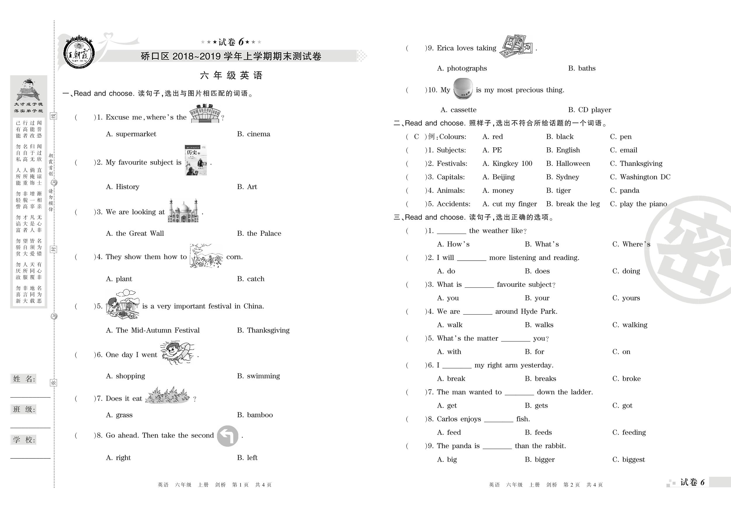 2018-2019学年第一学期武汉市硚口区六年级英语试卷(剑桥版)【6】