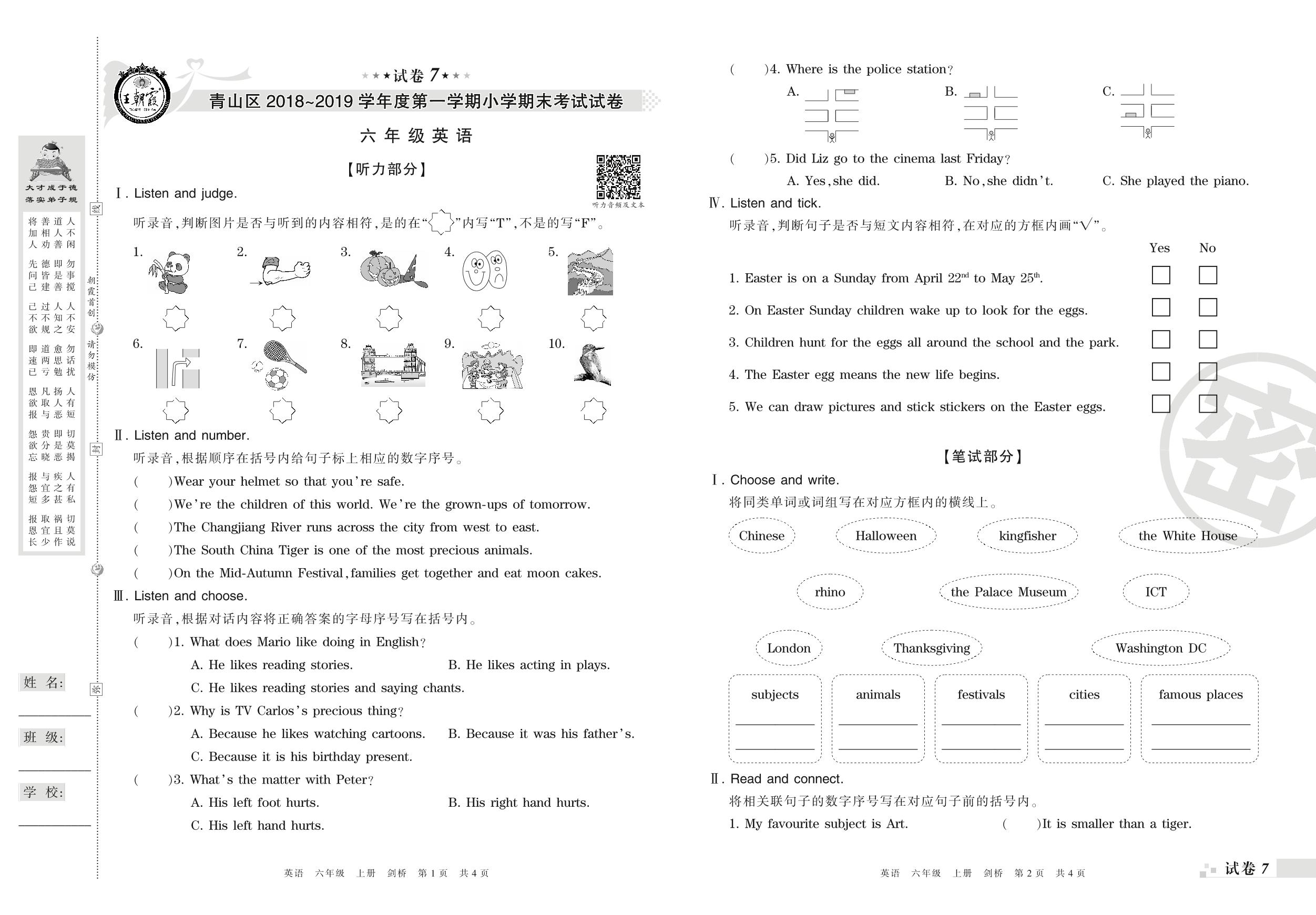 2018-2019学年第一学期武汉市青山区六年级英语试卷(剑桥版)【7】