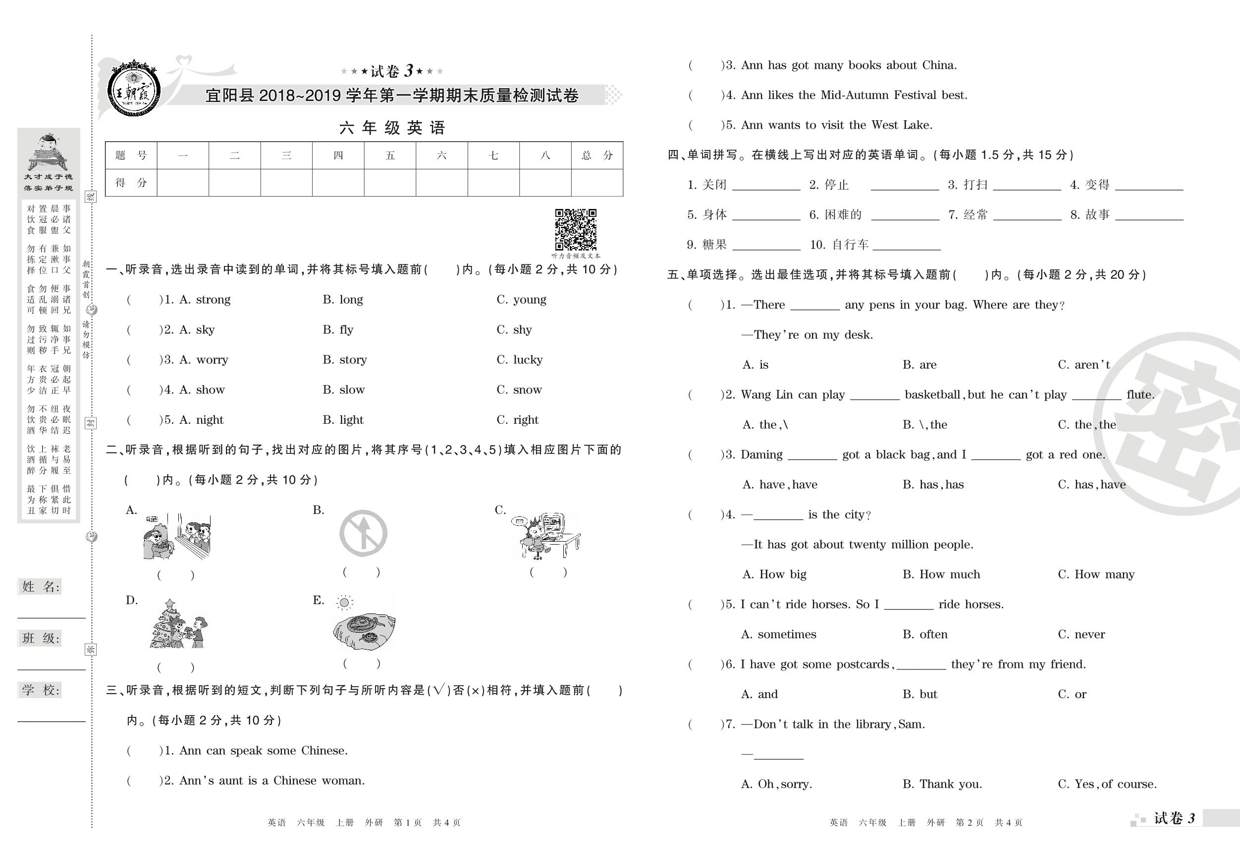 2018-2019学年第一学期洛阳市宜阳县六年级英语试卷(外研版)【3】