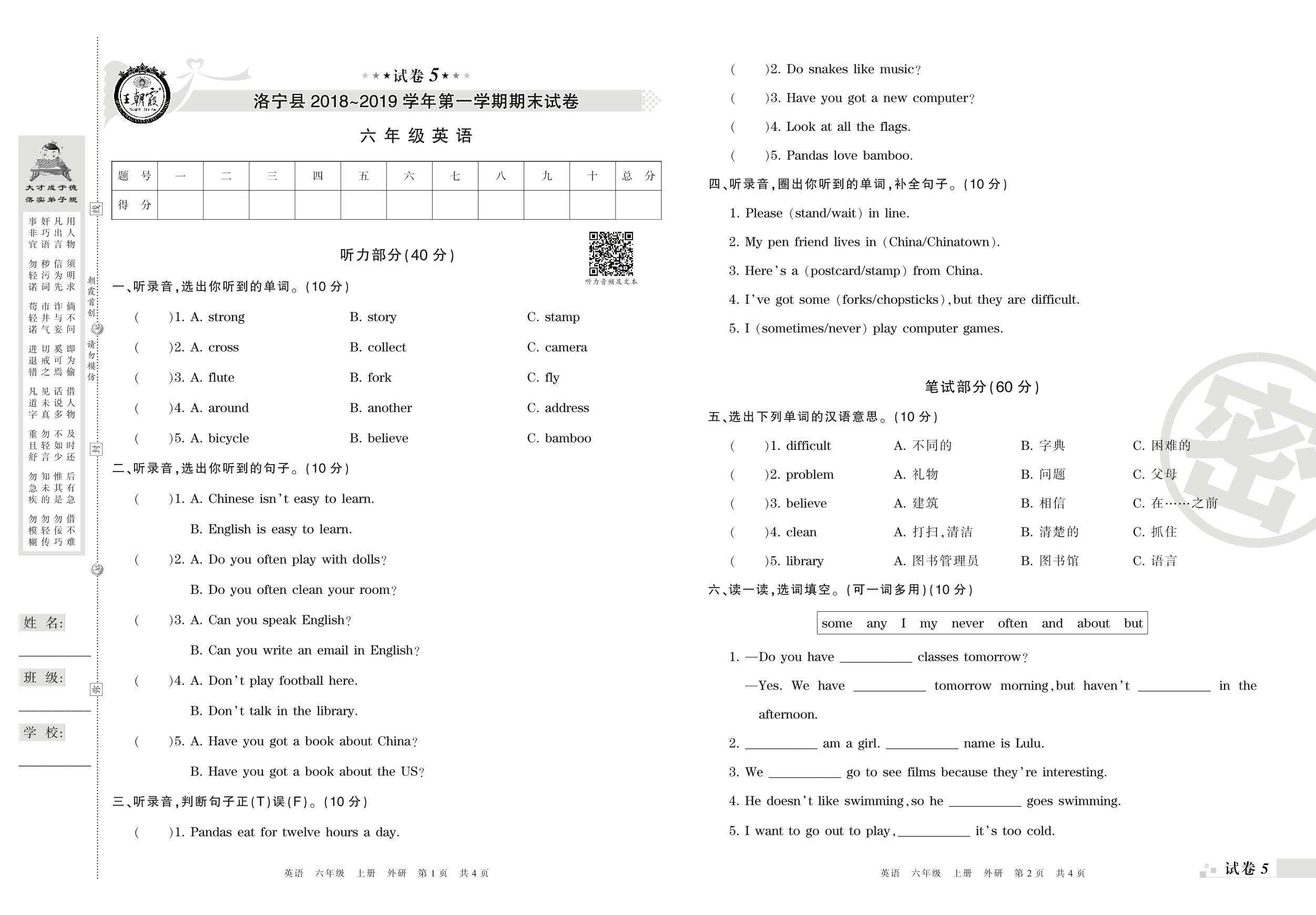 2018-2019学年第一学期洛阳市洛宁县六年级英语试卷(外研版)【5】
