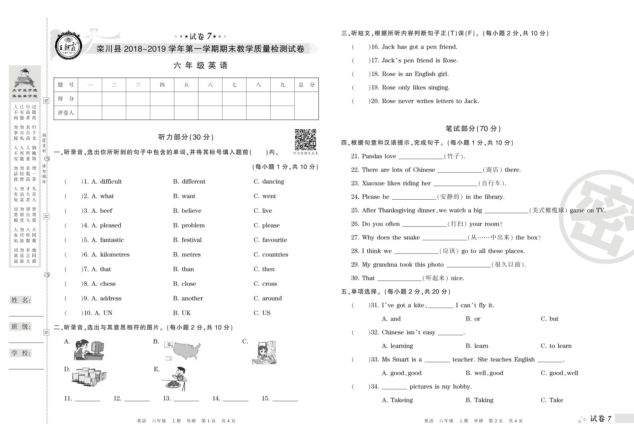 2018-2019学年第一学期洛阳市栾川县六年级英语试卷(外研版)【7】