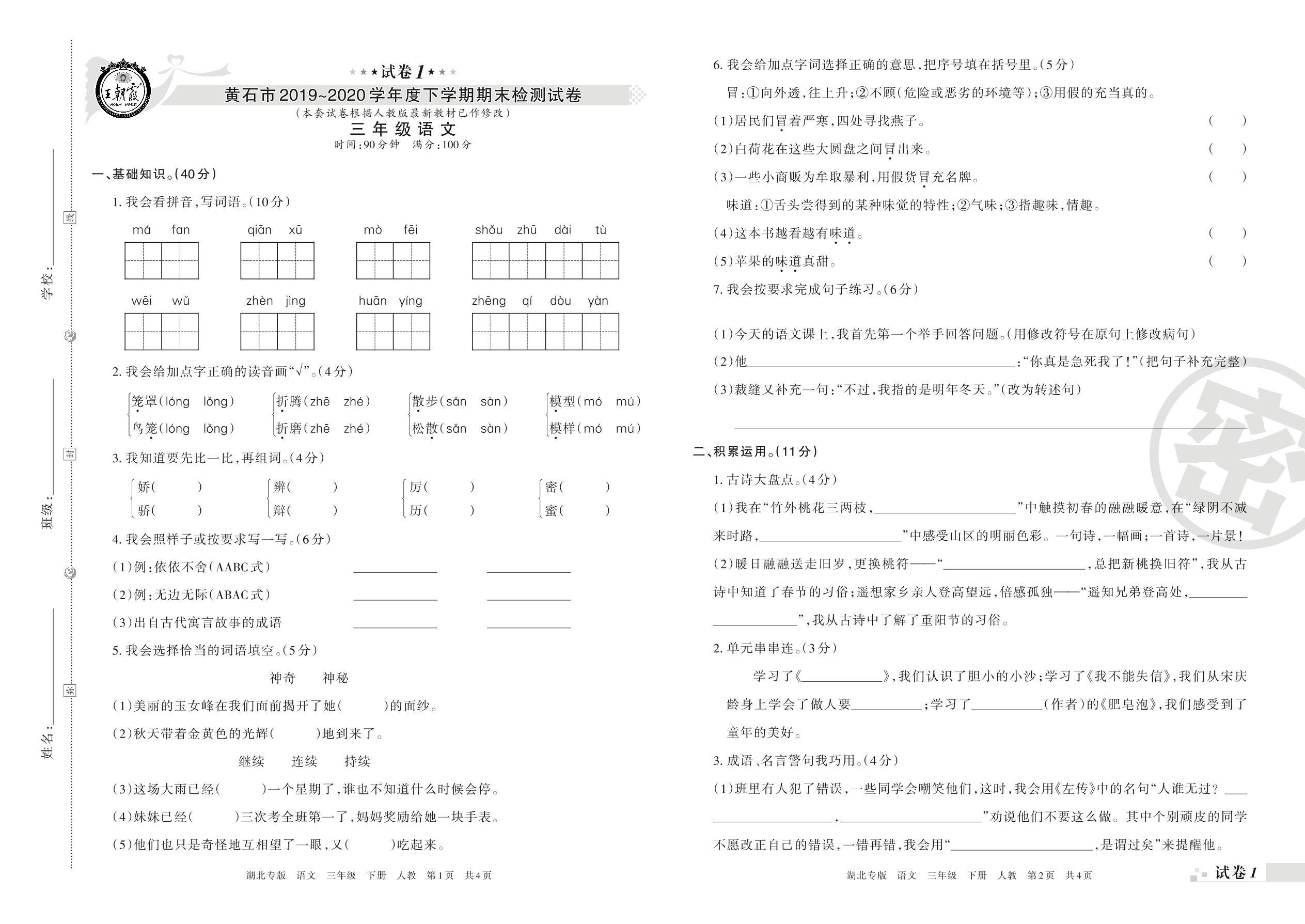 2019-2020学年第二学期黄石市三年级语文试卷(人教版)【1】