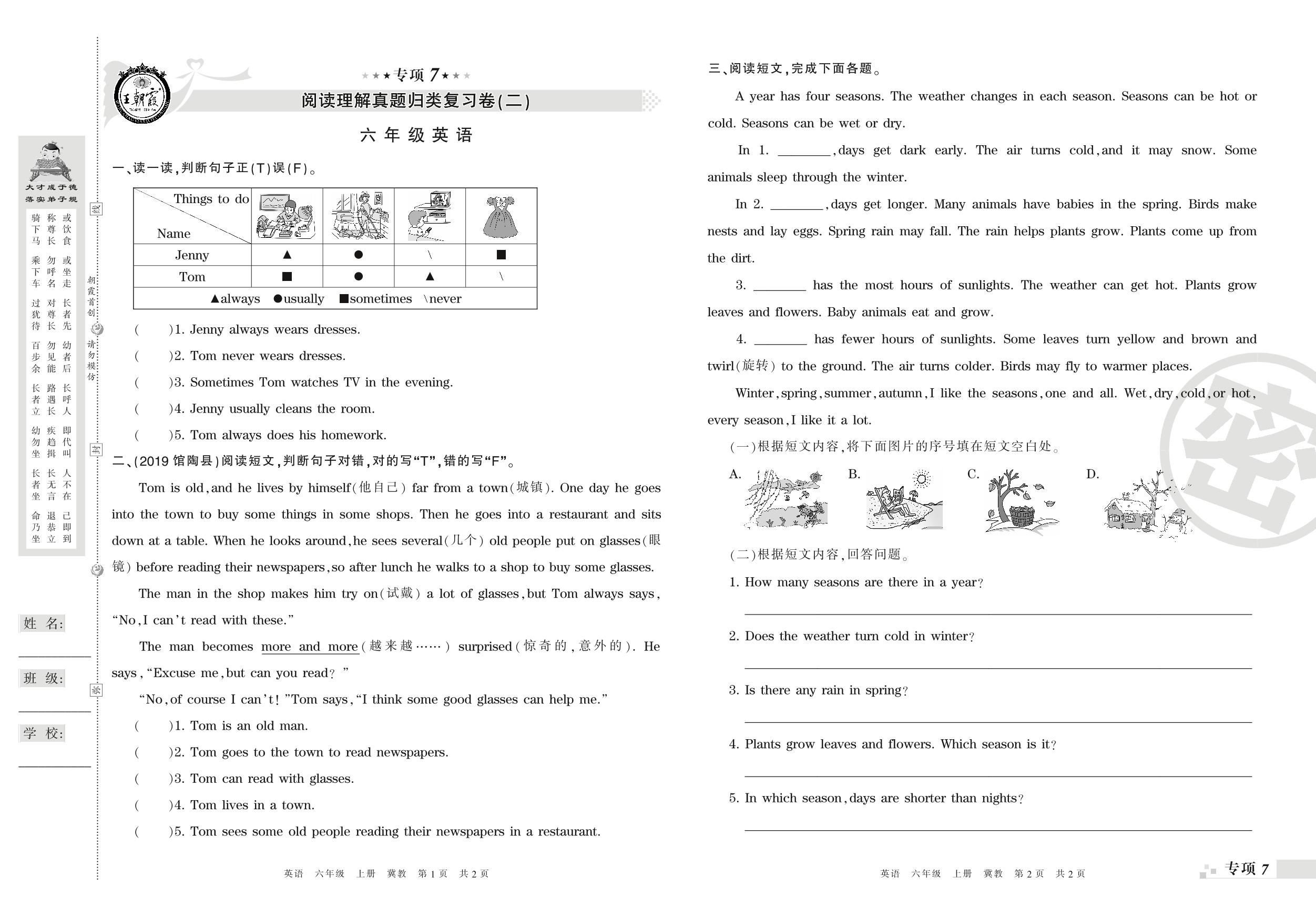 王朝霞期末专项卷——阅读理解、补全短文与写作真题归类复习六年级上册英语(冀教版)_R210807164230【0】