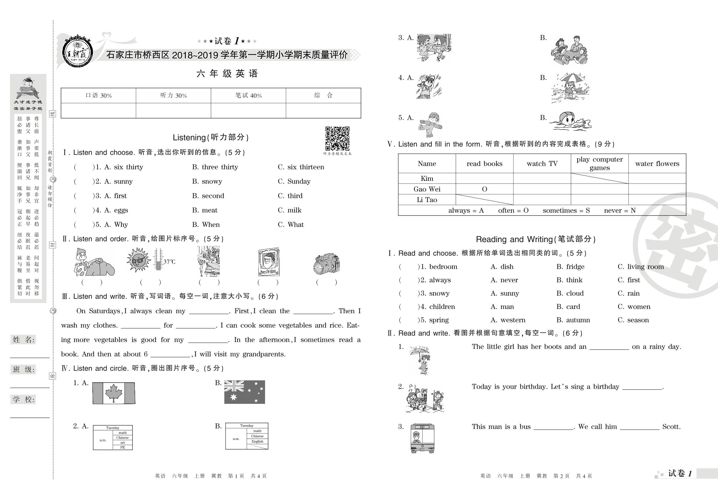 2018-2019学年第一学期石家庄市桥西区六年级英语试卷(冀教版)【1】