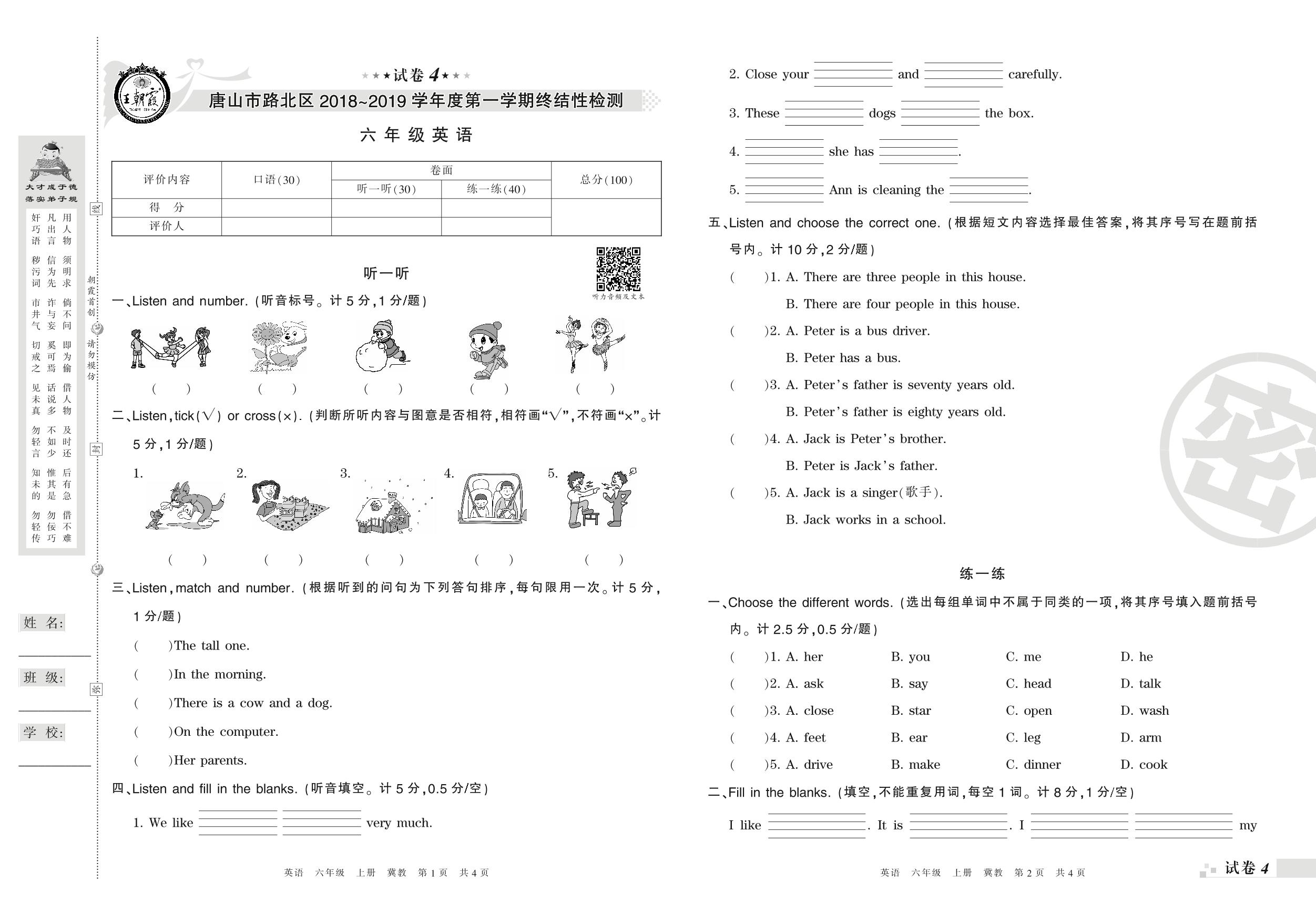 2018-2019学年第一学期唐山市路北区六年级英语试卷(冀教版)【4】