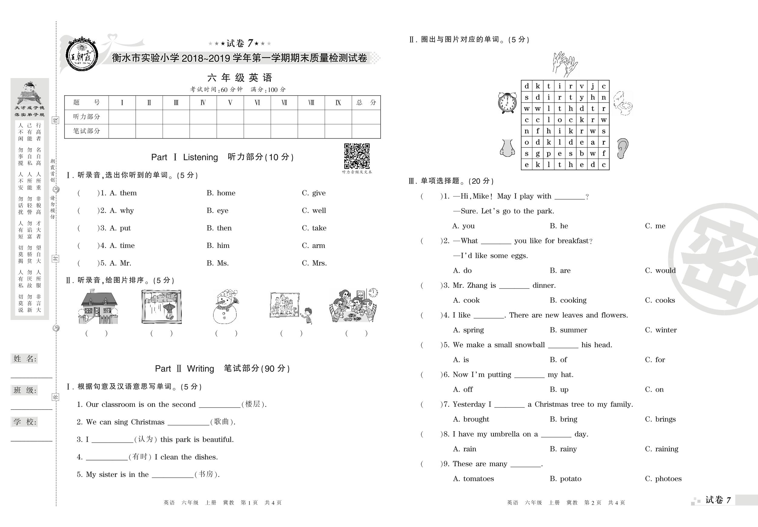2018-2019学年第一学期衡水市实验小学六年级英语试卷(冀教版)【7】