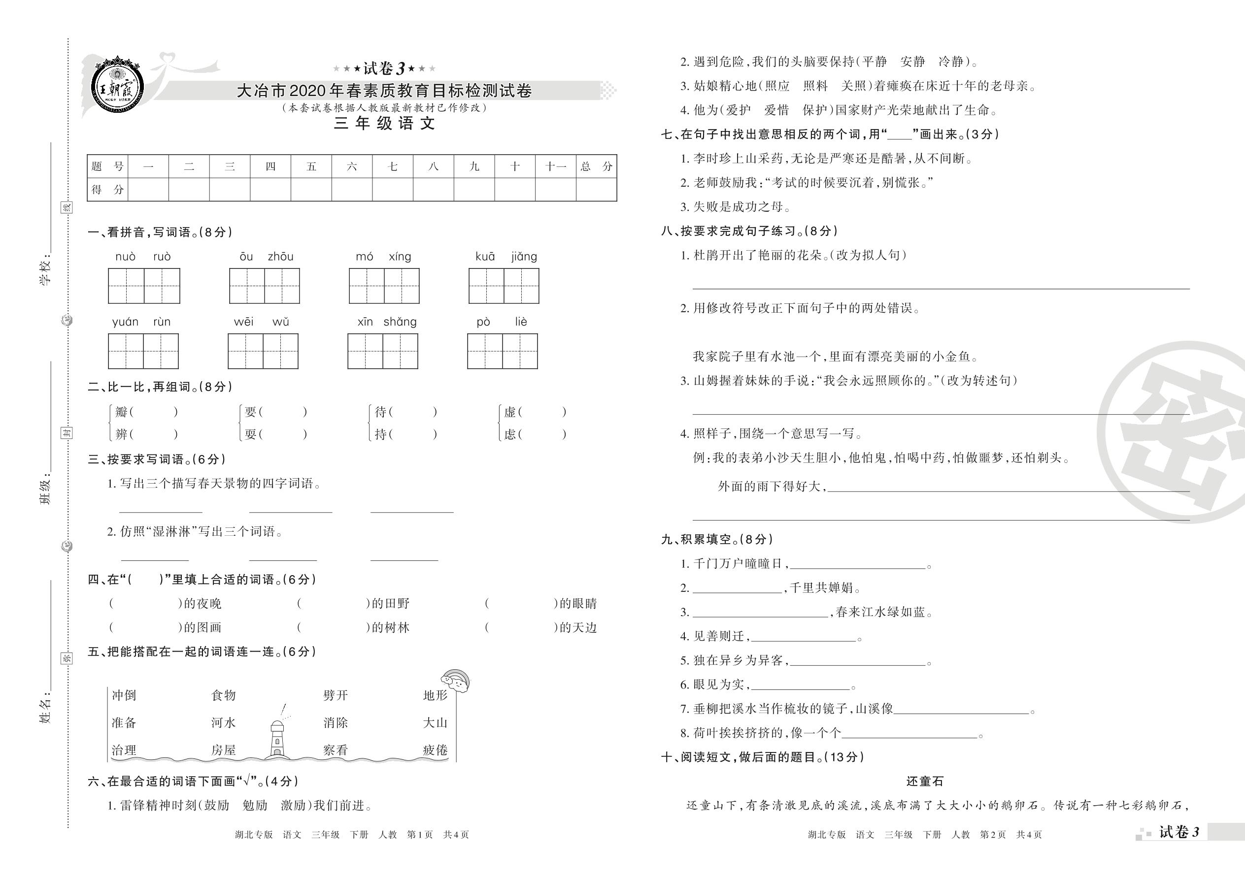 2019-2020学年第二学期大冶市三年级语文试卷(人教版)【3】