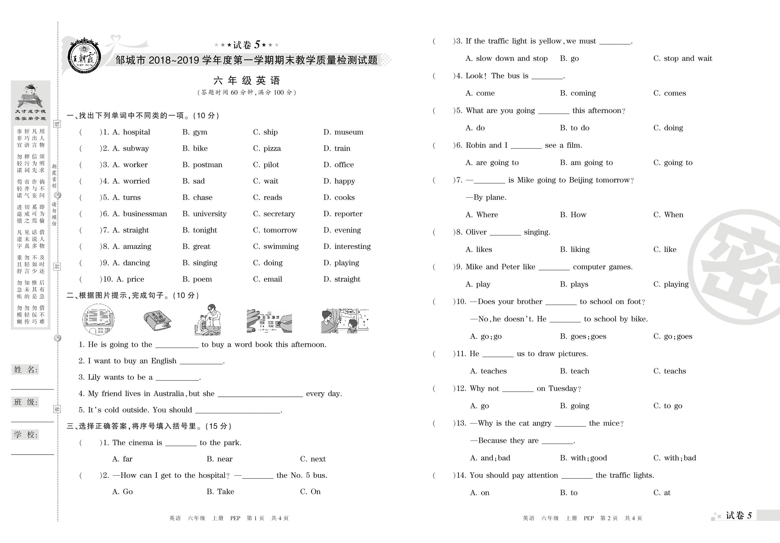 2018-2019学年第一学期邹城市六年级英语试卷(PEP版)【5】