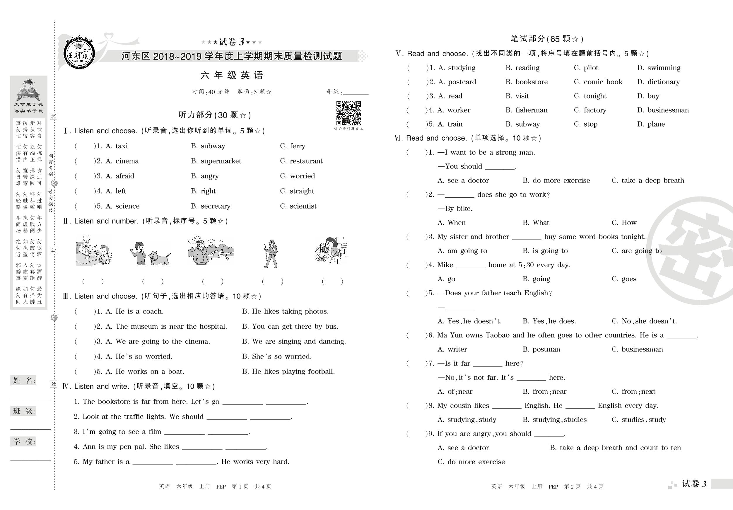 2018-2019学年第一学期临沂市河东区六年级英语试卷(PEP版)【3】