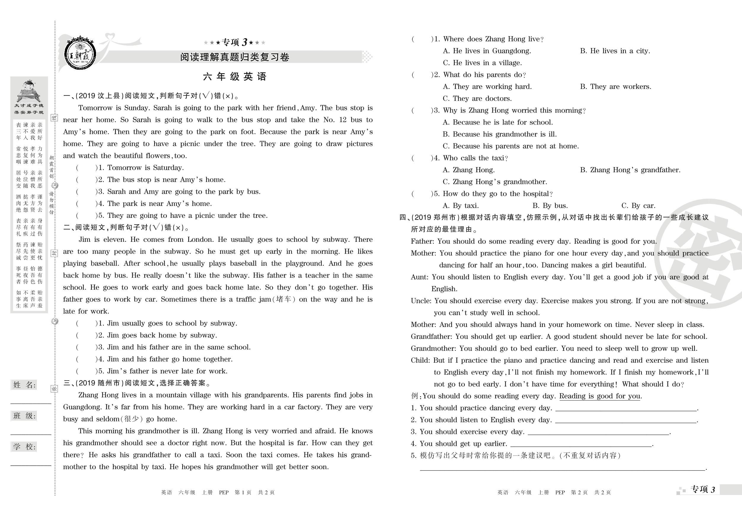 王朝霞期末专项卷——阅读理解、补全对话与书面表达真题归类复习六年级上册英语(PEP版)_R210807164443【0】