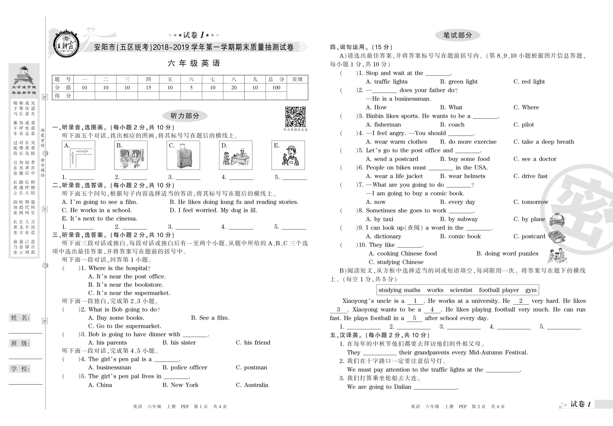 2018-2019学年第一学期安阳市六年级英语试卷(PEP版)【1】