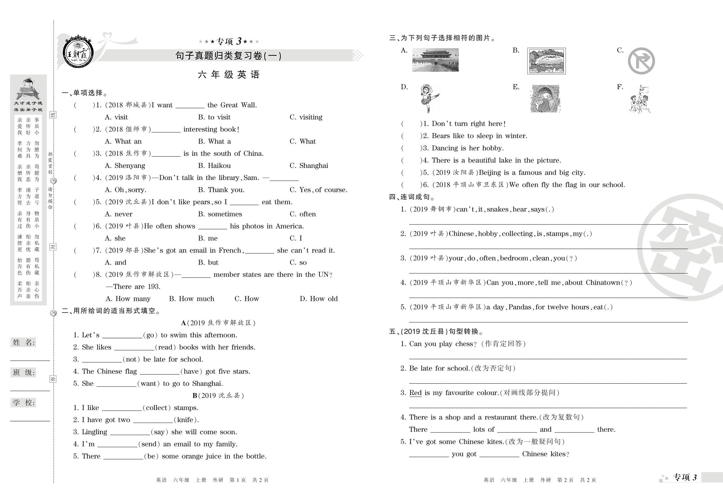 王朝霞期末专项卷——句子真题归类复习六年级上册英语(外研版)_R210807164519【0】